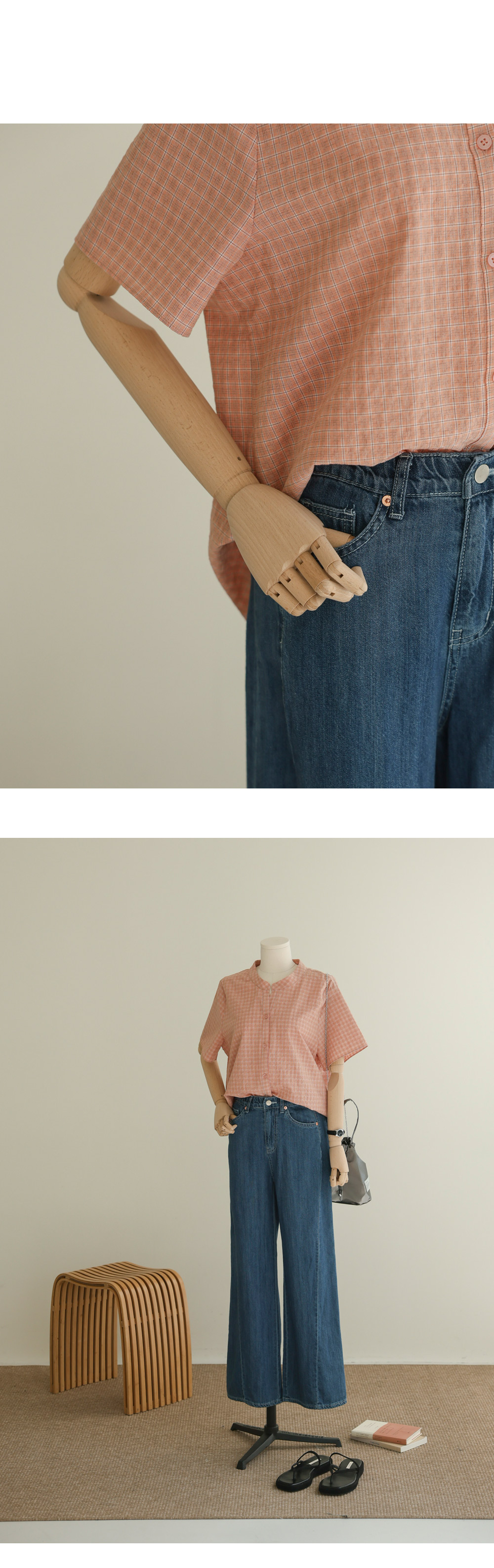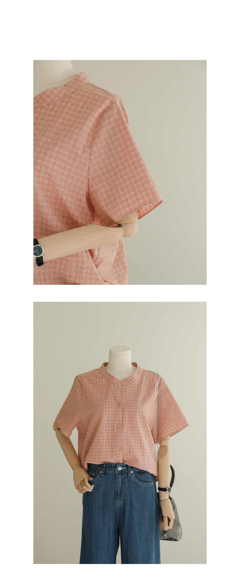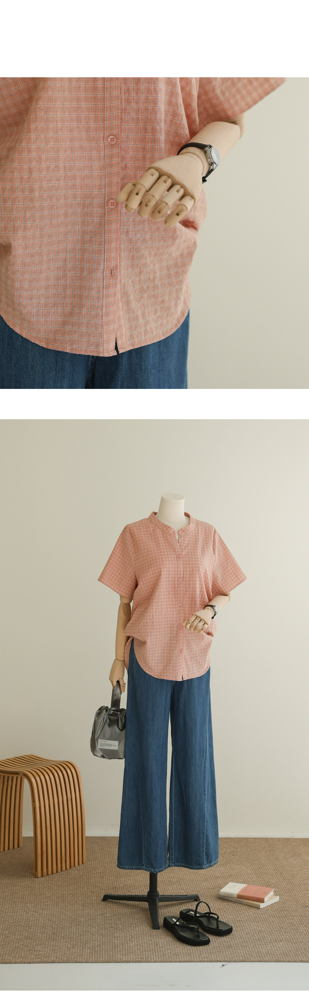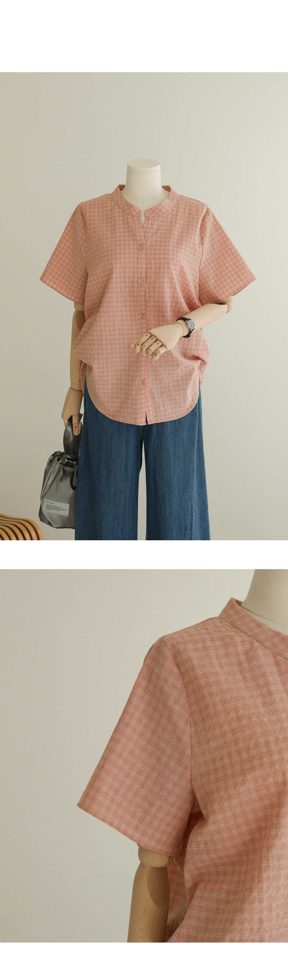 넥라인의 트임이 시선을 위로 끌어올려 상체를 가볍게 보이게 하고, 등의 핀턱이 자칫 밋밋하거나 덩치가 커 보일 수 있는 뒷모습을 입체감 있게 잡아주거든요. 얇지만 탄탄한 체크 원단 덕분에 몸에 붙지 않고 툭 떨어지는 실루엣이 하루 종일 유지된다는 점이 정말 매력적이에요.