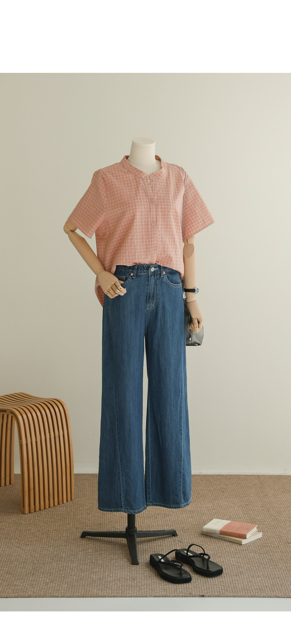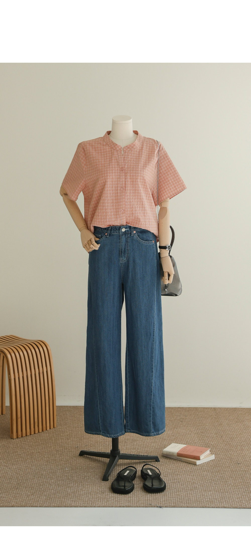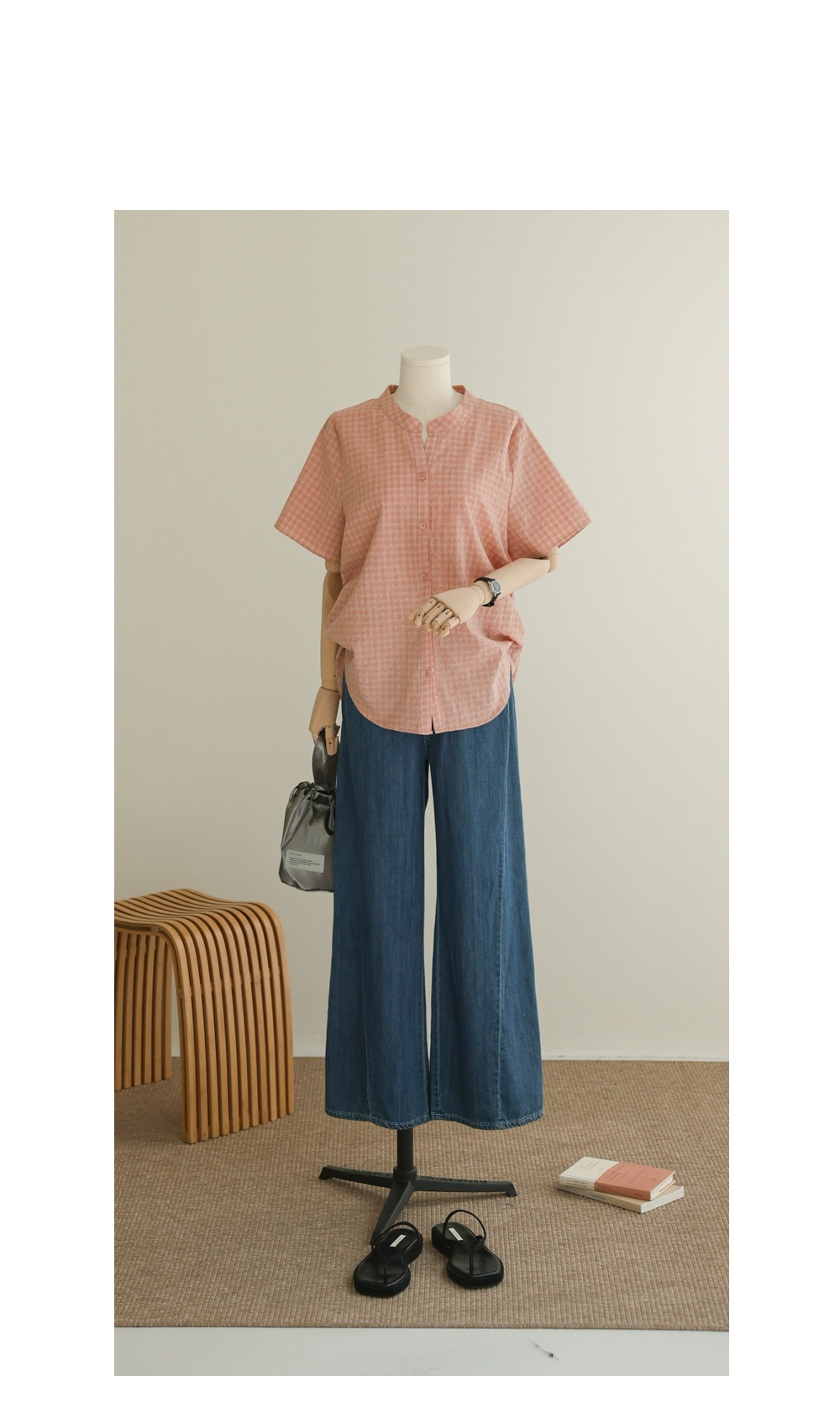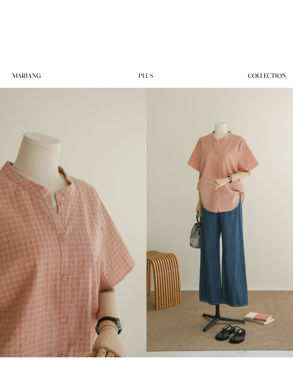 넥라인의 트임이 시선을 위로 끌어올려 상체를 가볍게 보이게 하고, 등의 핀턱이 자칫 밋밋하거나 덩치가 커 보일 수 있는 뒷모습을 입체감 있게 잡아주거든요. 얇지만 탄탄한 체크 원단 덕분에 몸에 붙지 않고 툭 떨어지는 실루엣이 하루 종일 유지된다는 점이 정말 매력적이에요.