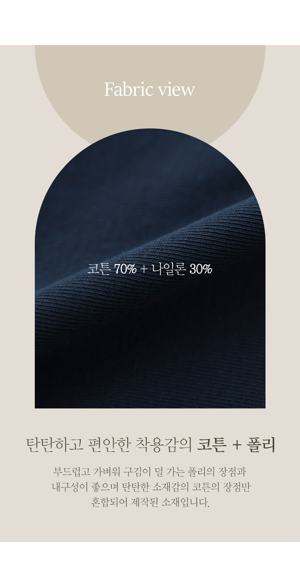 코튼 특유의 쾌적함과 폴리의 매끈함이 조화롭게 섞여 피부에 닿는 느낌이 정말 부드러운 소재예요. 가벼운 무게감을 가지고 있어 활동하기에 매우 쾌적하며, 탄탄한 소재감 덕분에 구김이 적어 관리가 수월하답니다. 소재 자체가 유연하여 활동하는 데 전혀 지장이 없고, 비침 걱정 없이 든든하게 입기 좋은 고퀄리티 원단이에요.