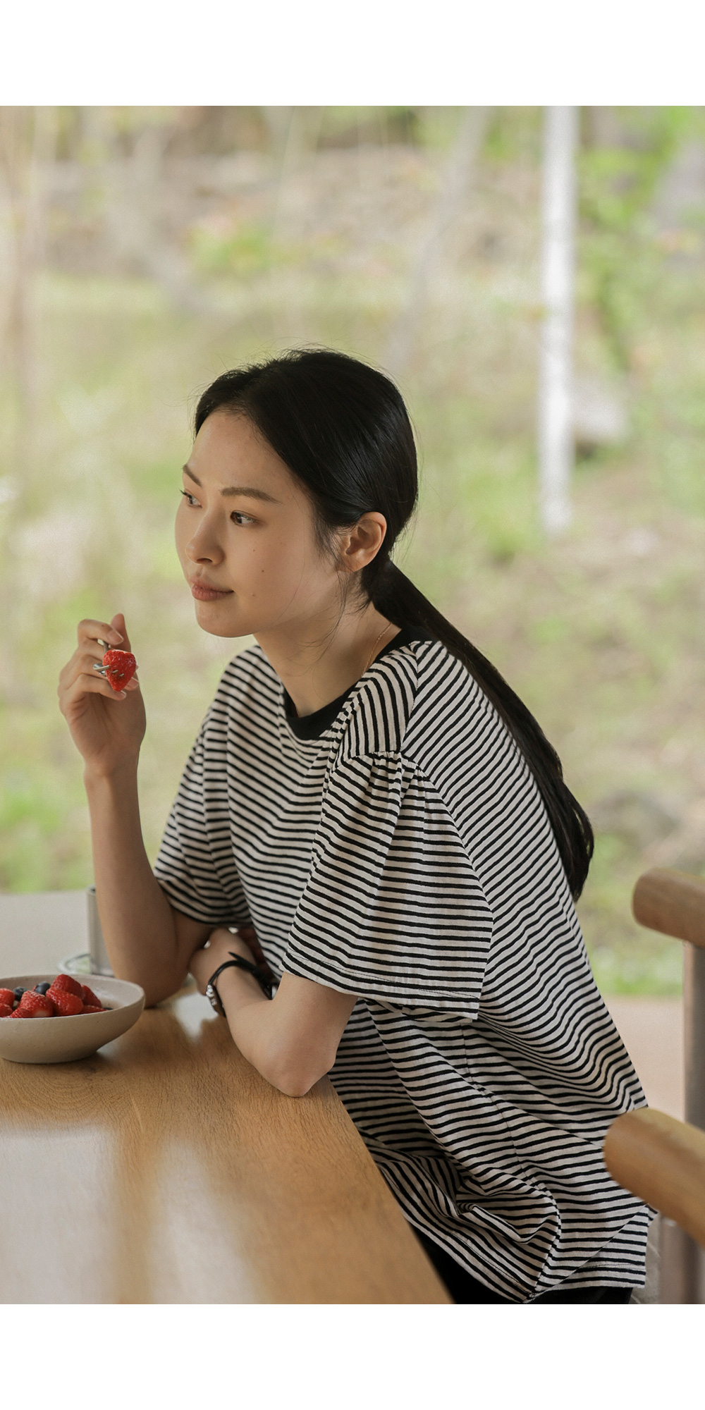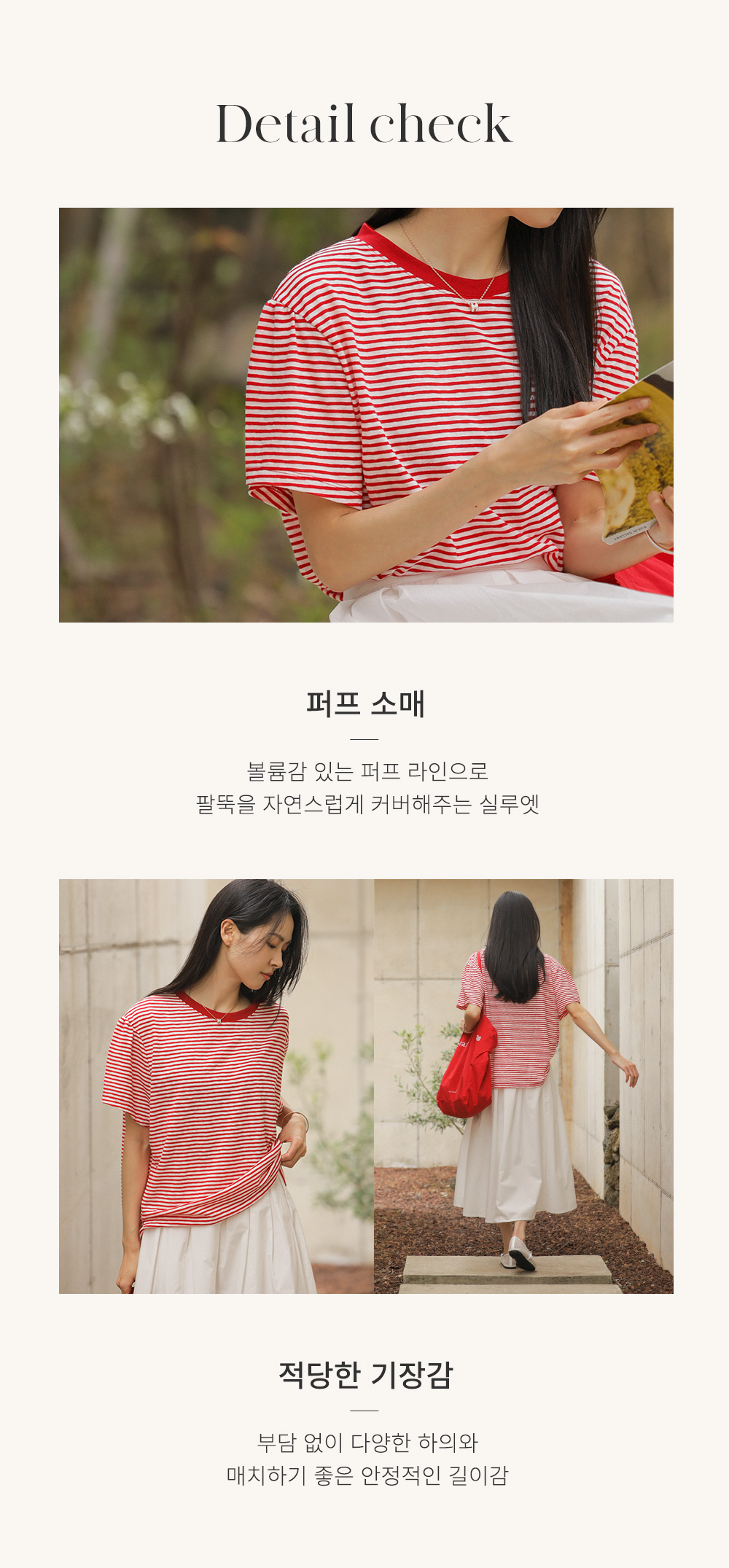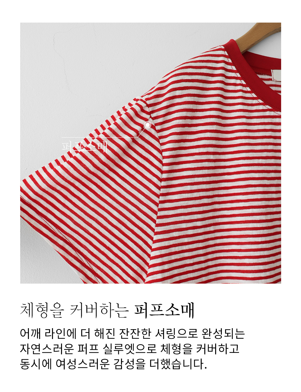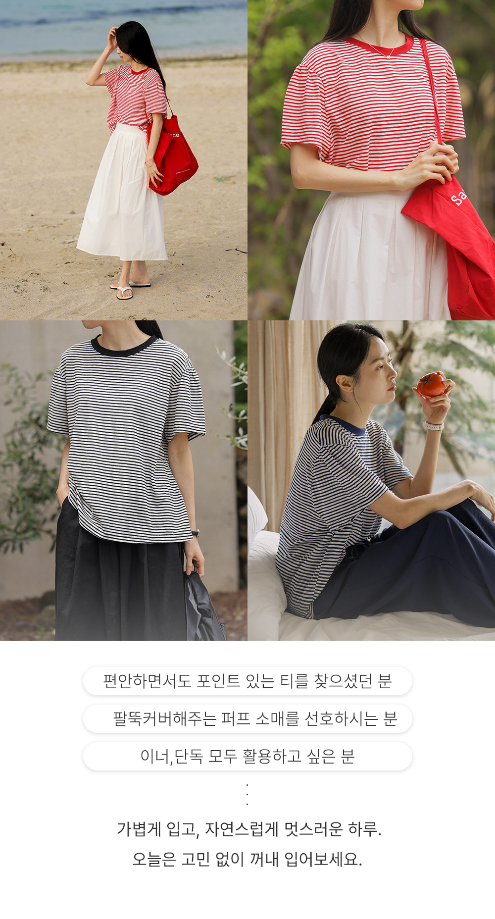 티셔츠 한 장으로 체형 보정과 스타일을 동시에 잡고 싶은 분들께 강력 추천드려요. 스트라이프의 클래식함과 퍼프의 로맨틱함이 조화로워 스커트나 슬랙스 어디에나 잘 어울리는 만능 아이템이 될 거예요.