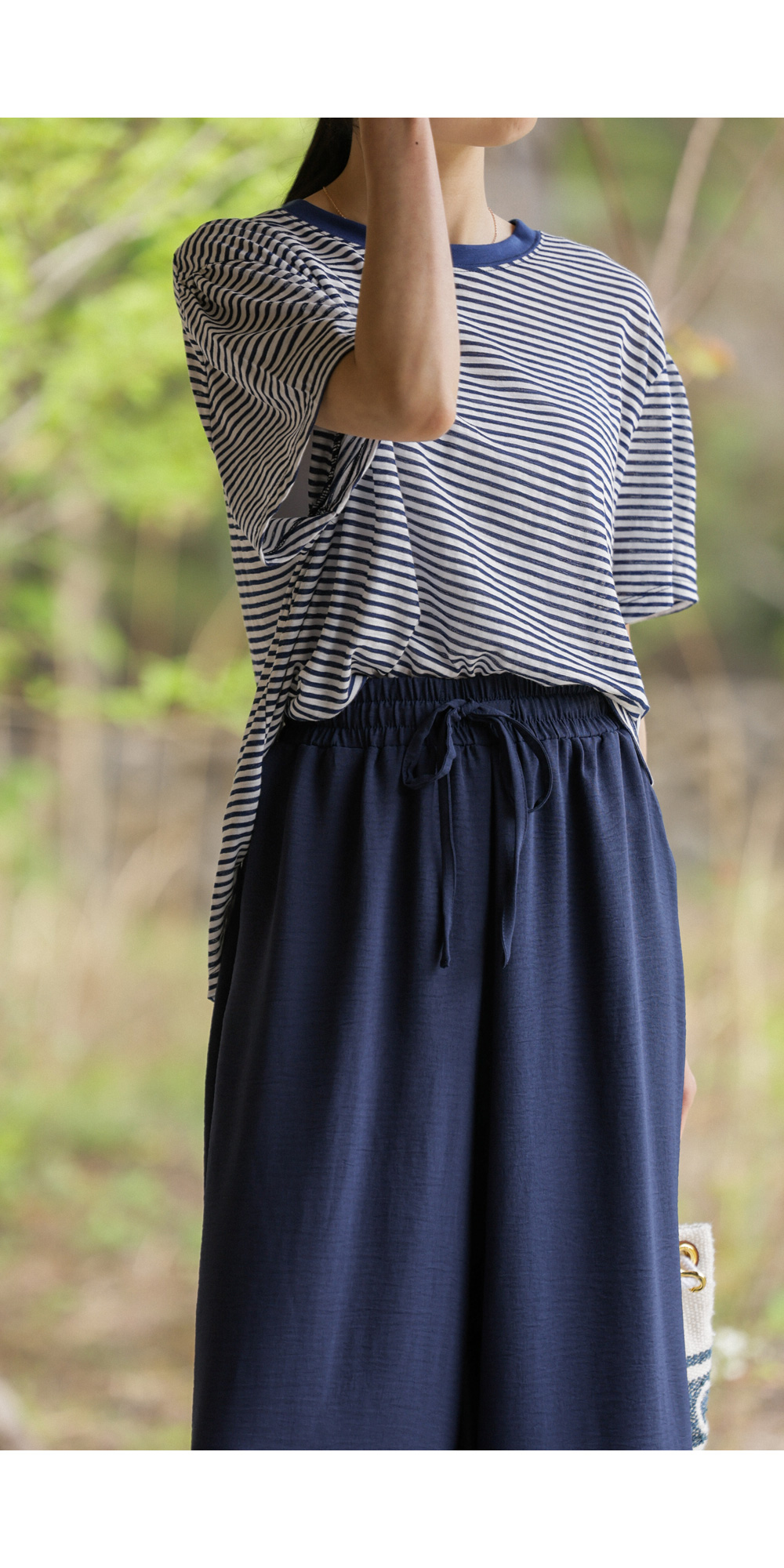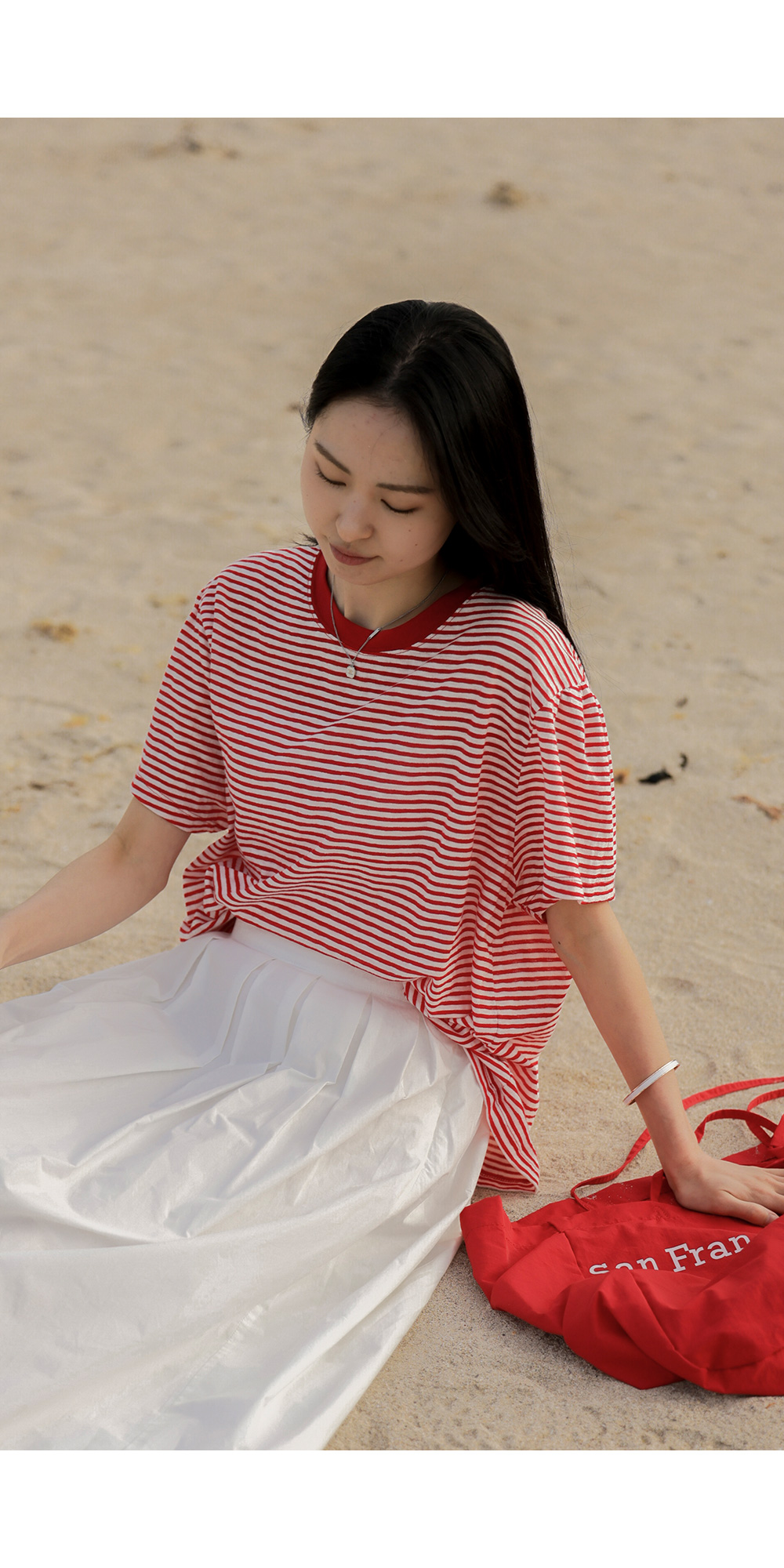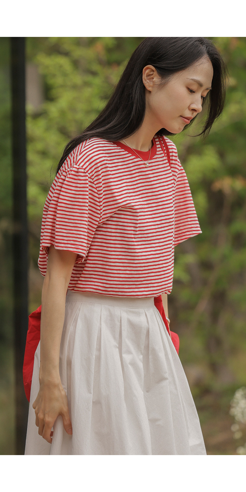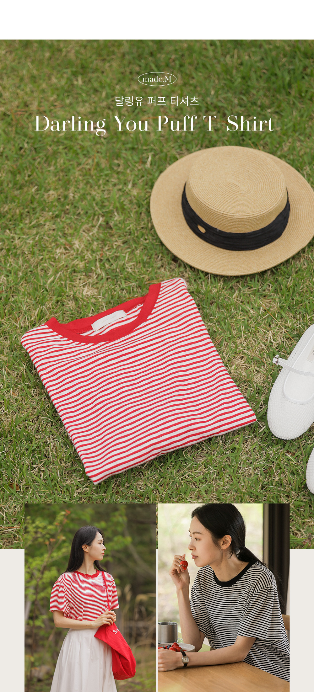 티셔츠 한 장으로 체형 보정과 스타일을 동시에 잡고 싶은 분들께 강력 추천드려요. 스트라이프의 클래식함과 퍼프의 로맨틱함이 조화로워 스커트나 슬랙스 어디에나 잘 어울리는 만능 아이템이 될 거예요.