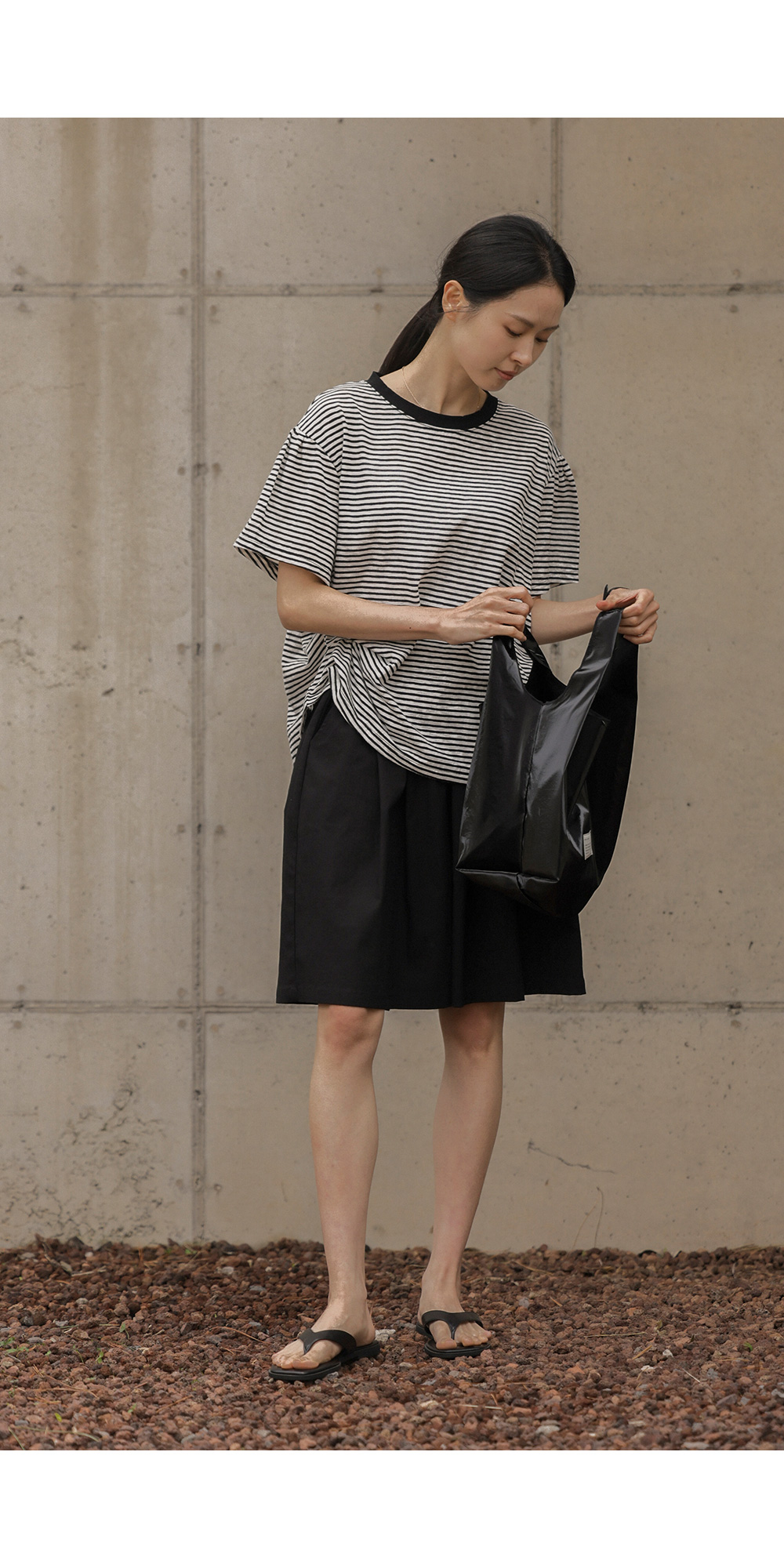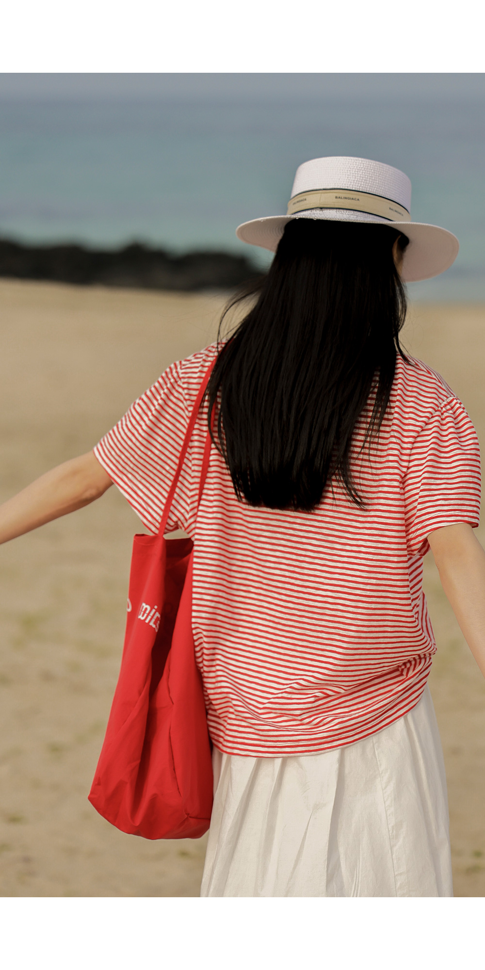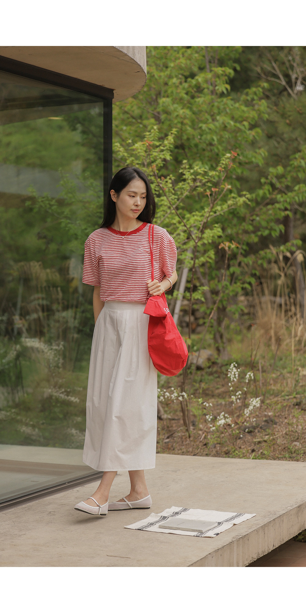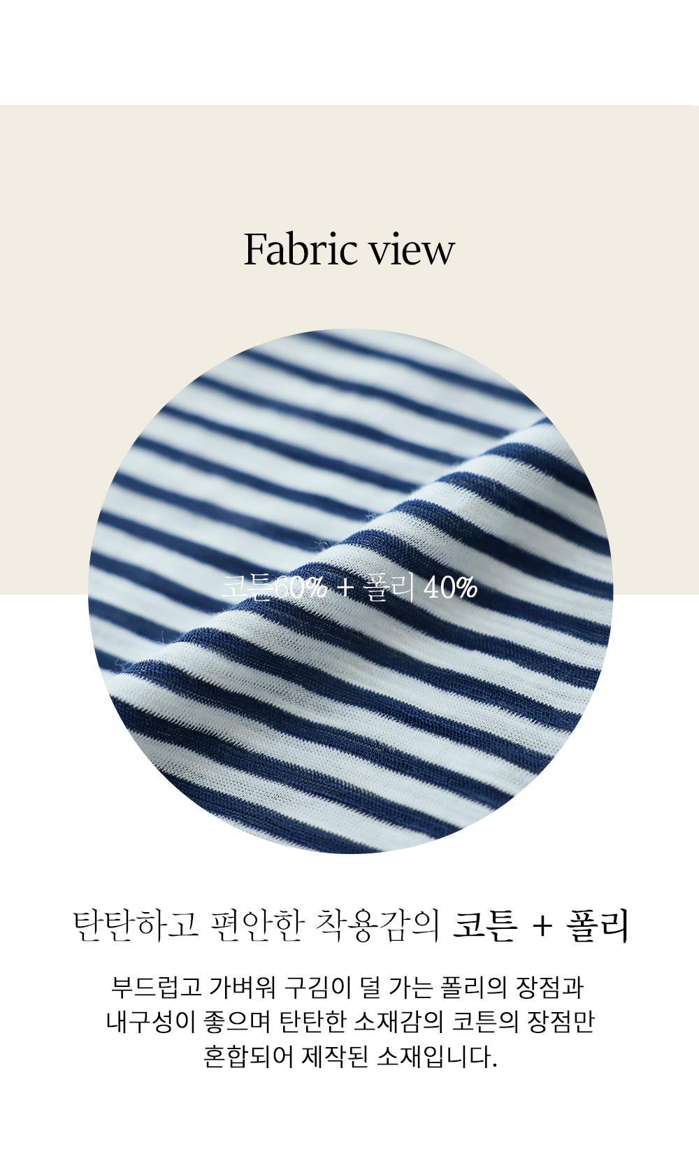 넥 라인의 시보리 배색과 어깨 퍼프의 만남이 평범한 스트라이프 티셔츠를 특별한 외출복으로 만들어주는 한 끗 차이예요. 부드러운 터치감 속에 숨겨진 탄탄한 힘이 몸의 라인을 흐트러짐 없이 잡아주어 입었을 때의 만족도가 남다르답니다.