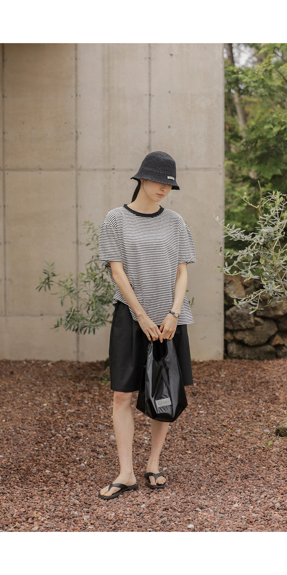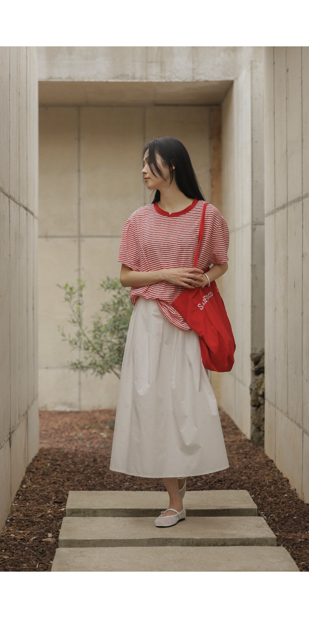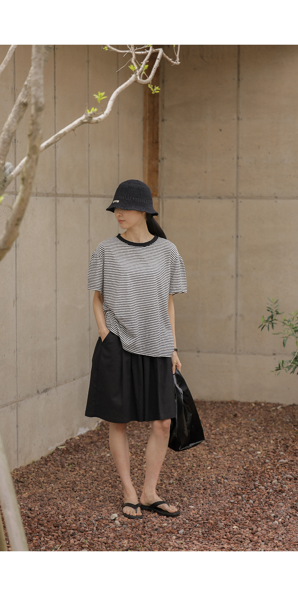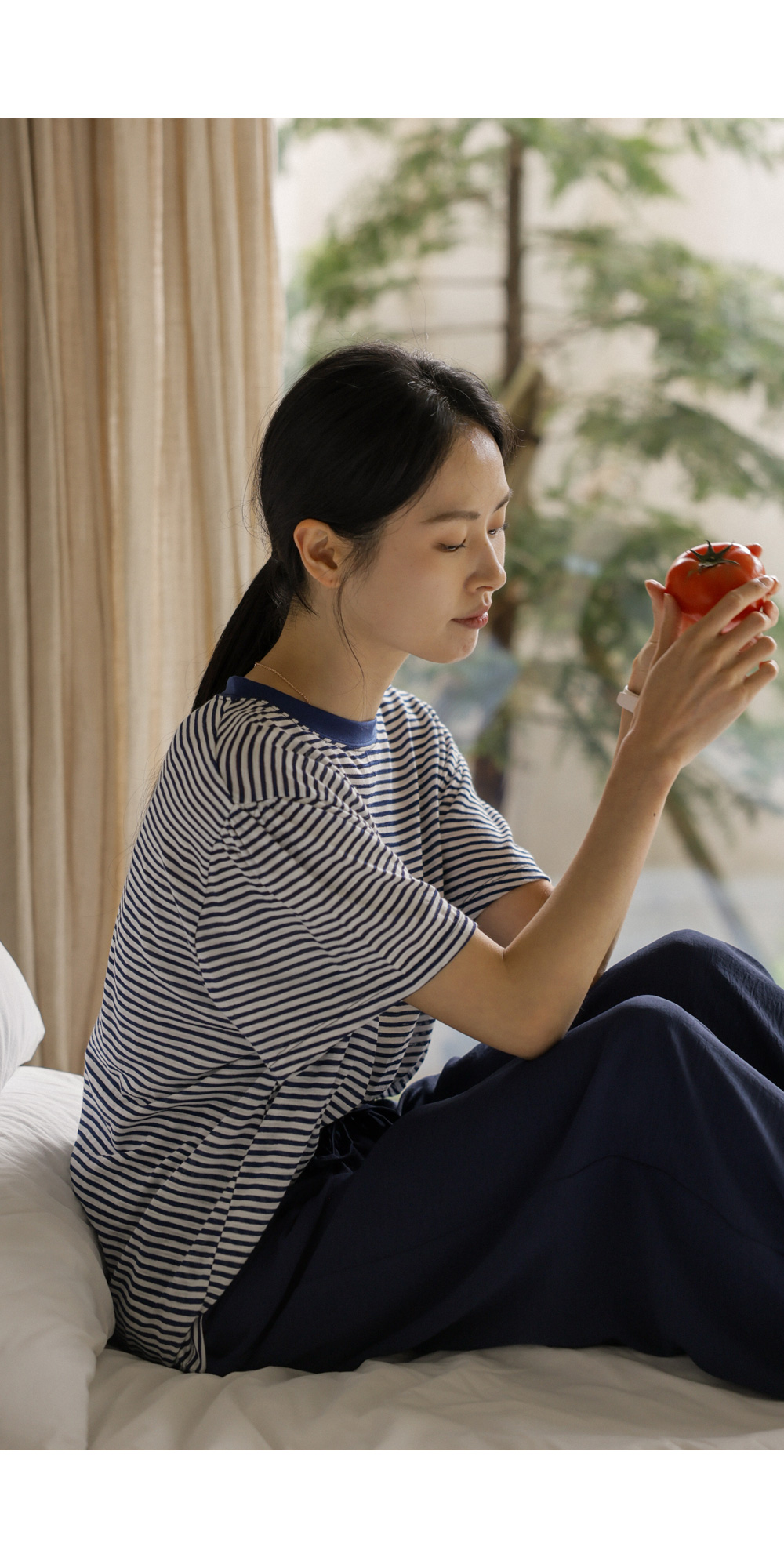 넥 라인의 시보리 배색과 어깨 퍼프의 만남이 평범한 스트라이프 티셔츠를 특별한 외출복으로 만들어주는 한 끗 차이예요. 부드러운 터치감 속에 숨겨진 탄탄한 힘이 몸의 라인을 흐트러짐 없이 잡아주어 입었을 때의 만족도가 남다르답니다.