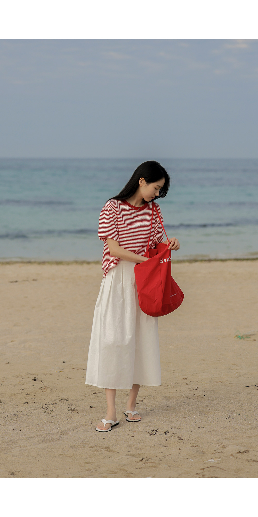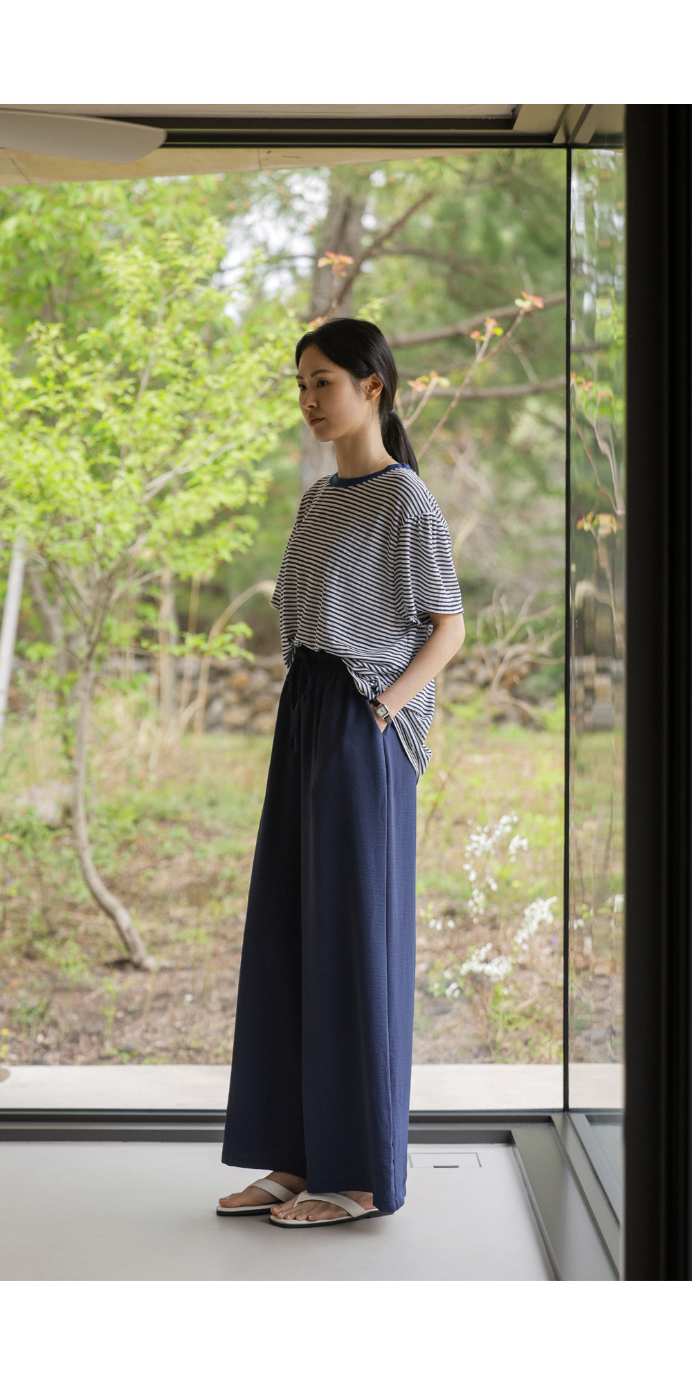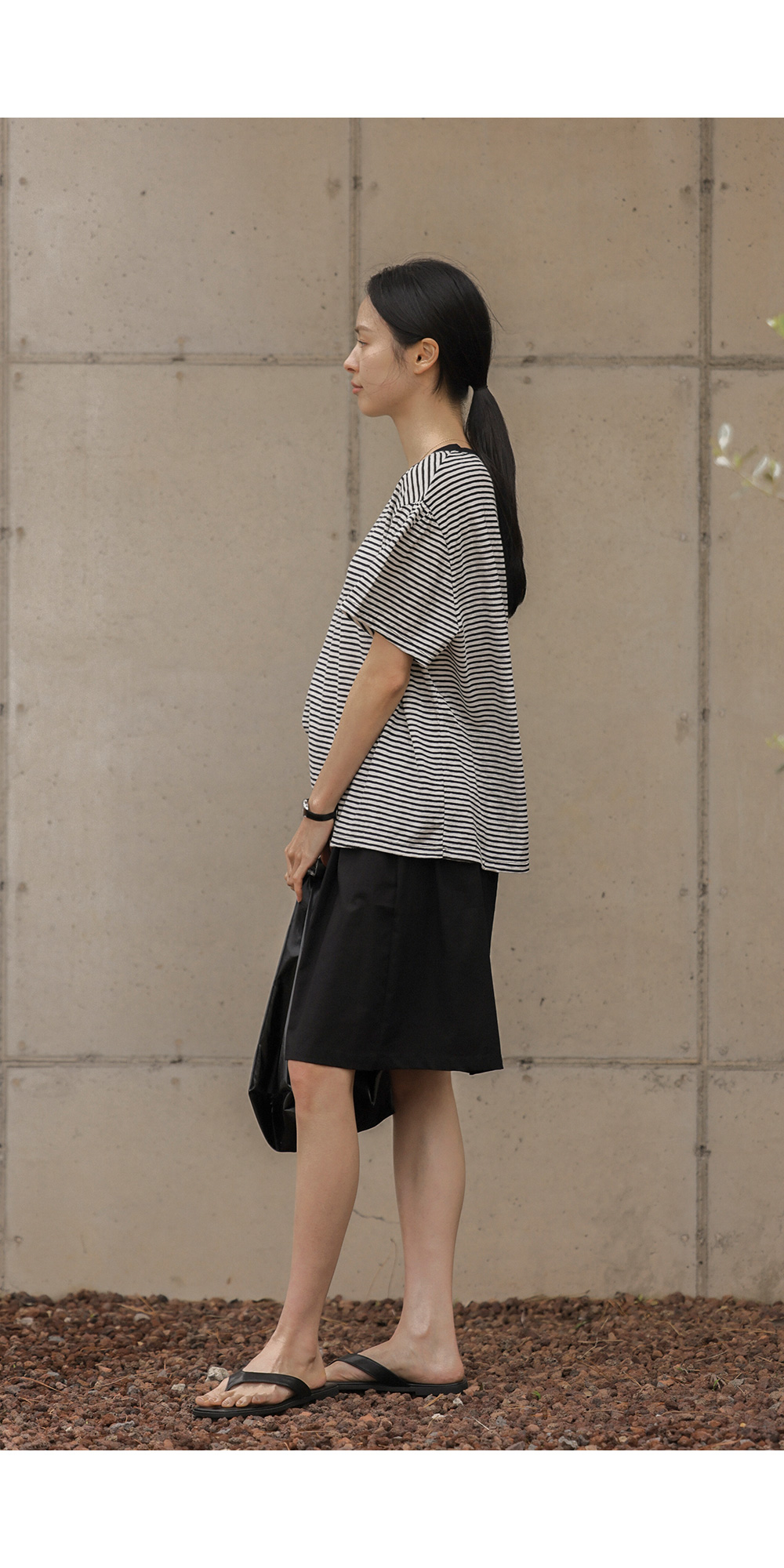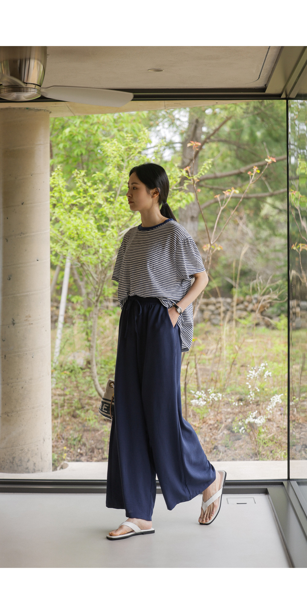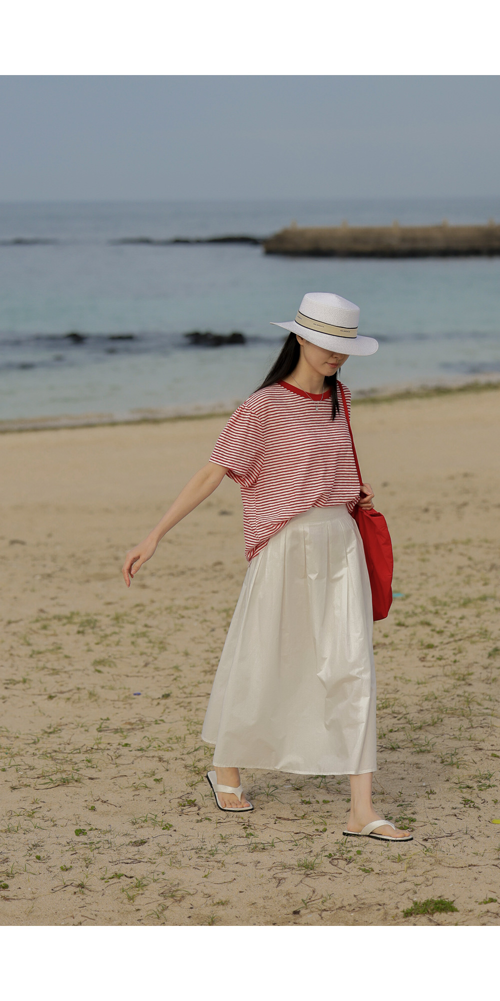 넥 라인의 시보리 배색과 어깨 퍼프의 만남이 평범한 스트라이프 티셔츠를 특별한 외출복으로 만들어주는 한 끗 차이예요. 부드러운 터치감 속에 숨겨진 탄탄한 힘이 몸의 라인을 흐트러짐 없이 잡아주어 입었을 때의 만족도가 남다르답니다.