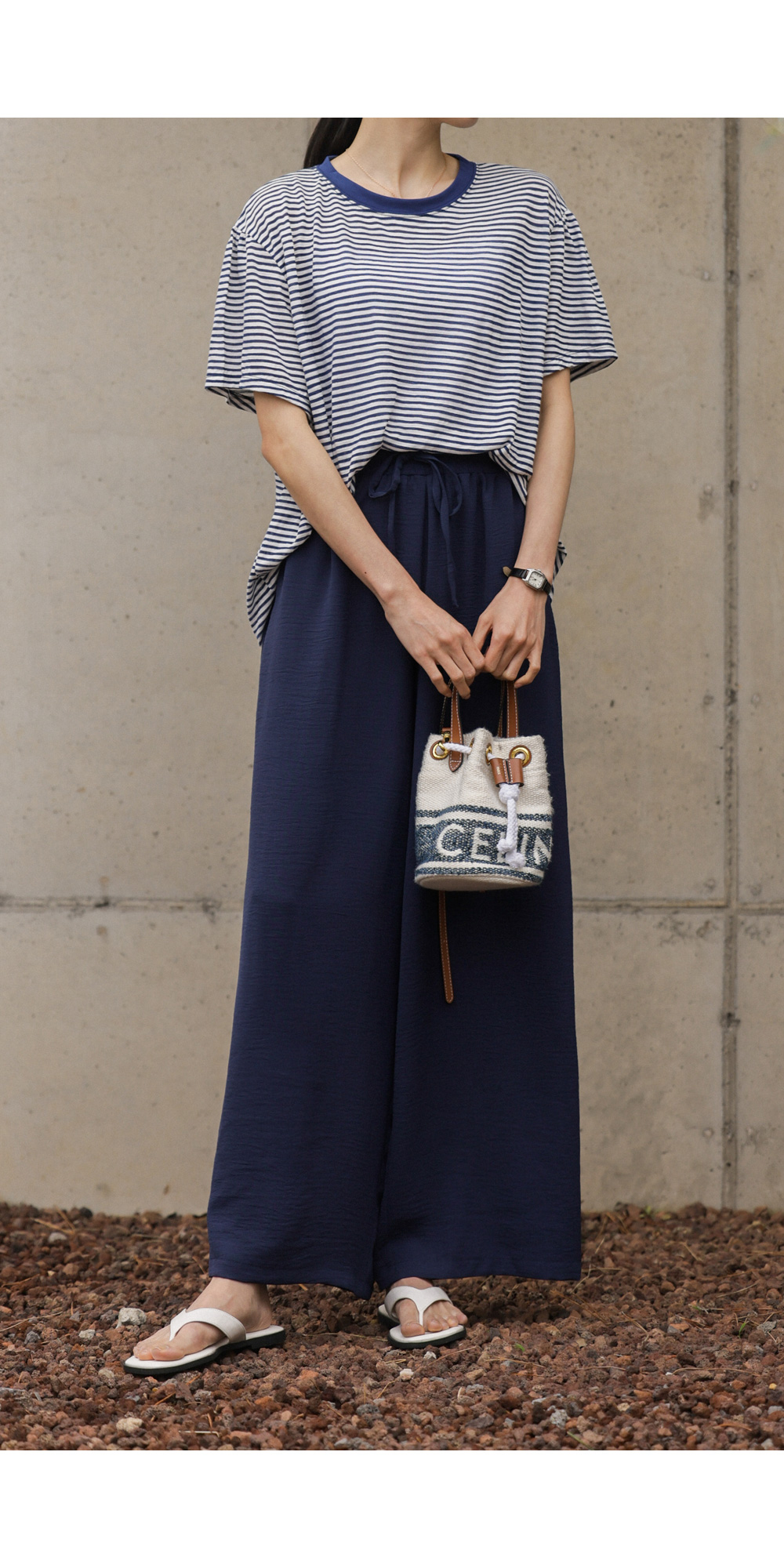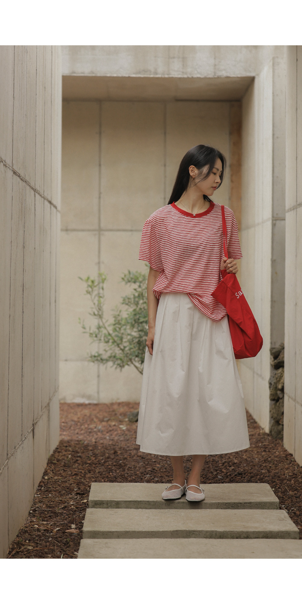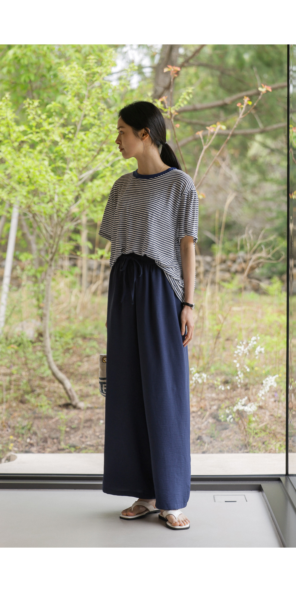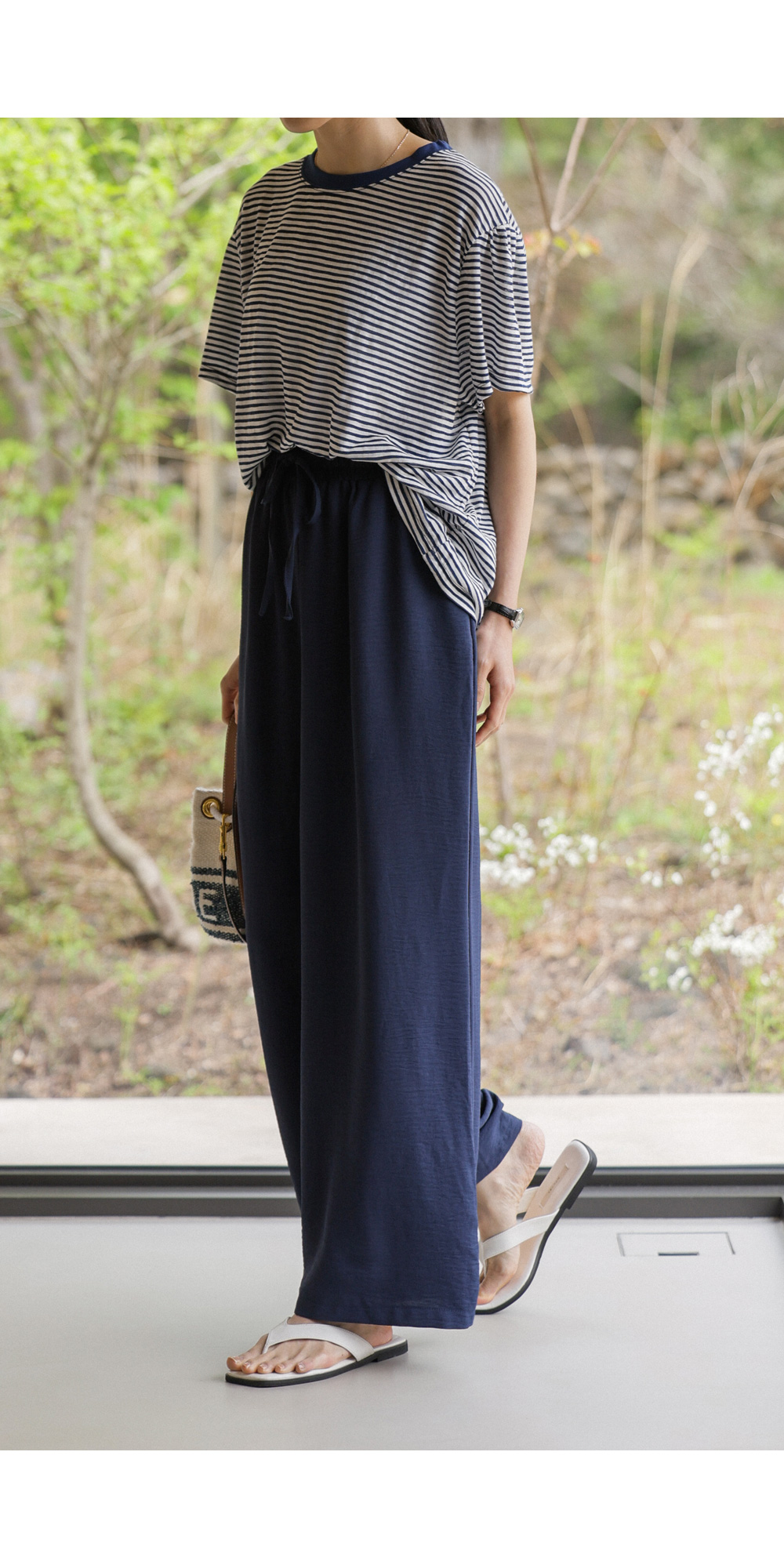넥 라인의 시보리 배색과 어깨 퍼프의 만남이 평범한 스트라이프 티셔츠를 특별한 외출복으로 만들어주는 한 끗 차이예요. 부드러운 터치감 속에 숨겨진 탄탄한 힘이 몸의 라인을 흐트러짐 없이 잡아주어 입었을 때의 만족도가 남다르답니다.