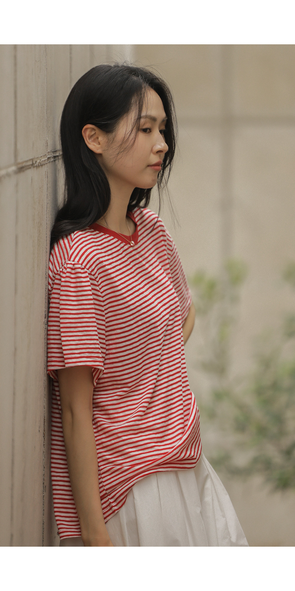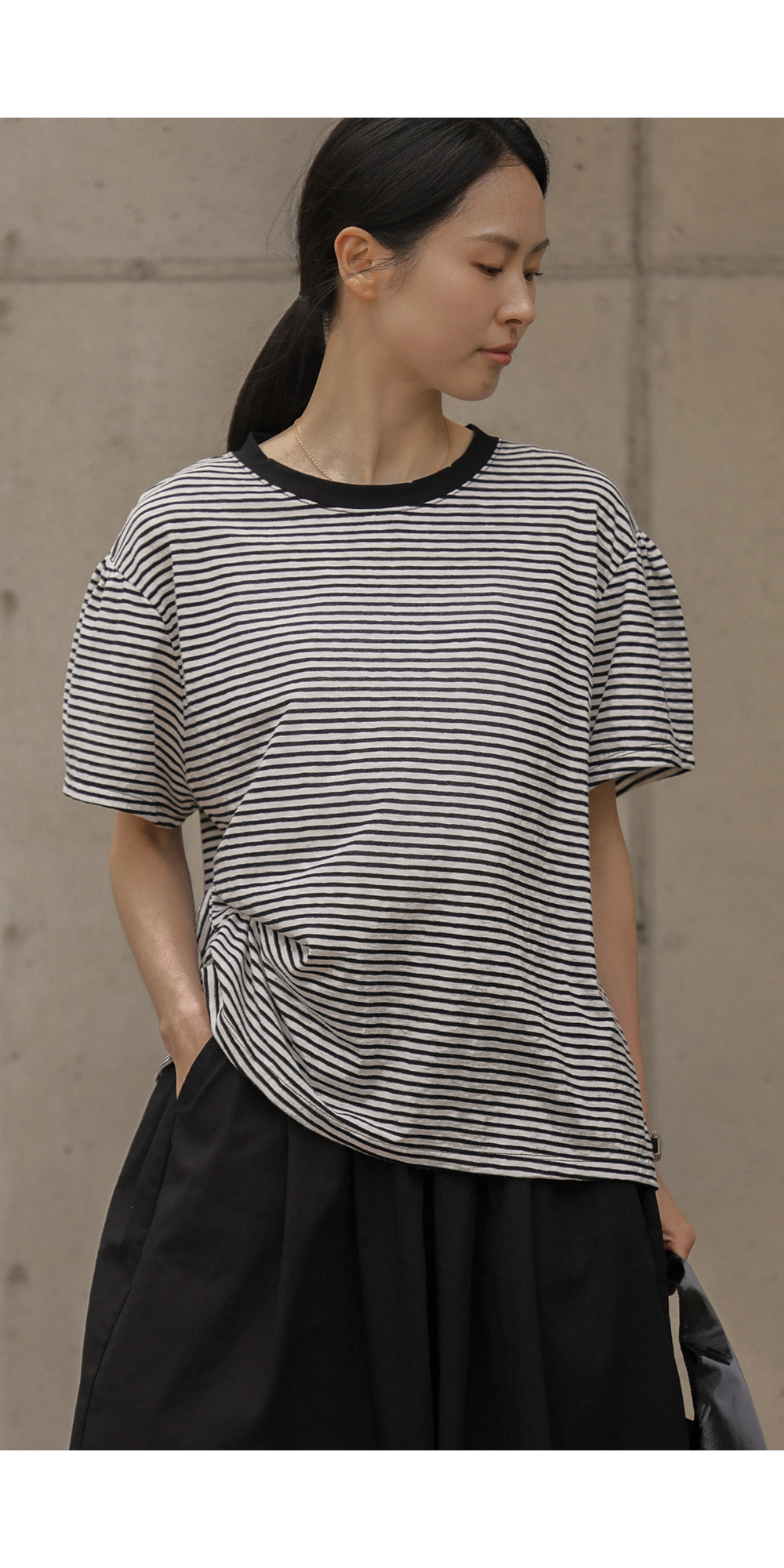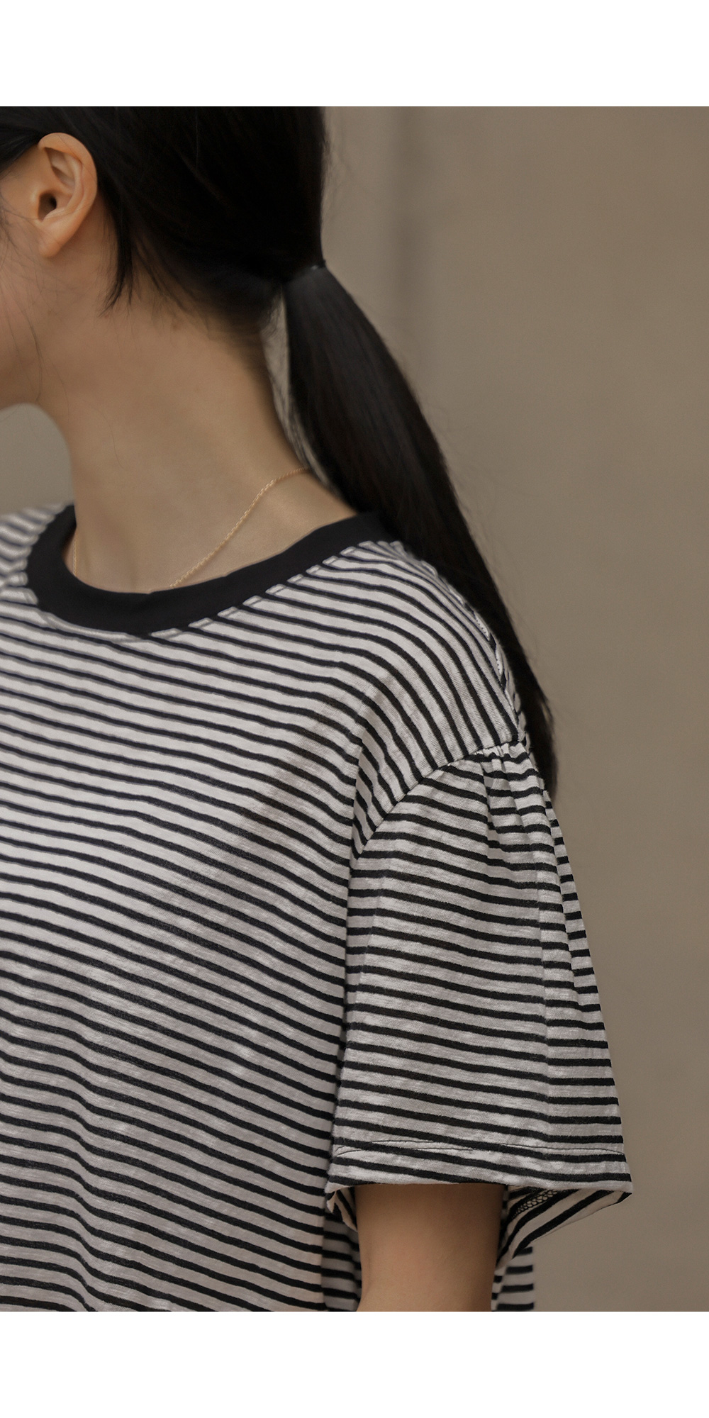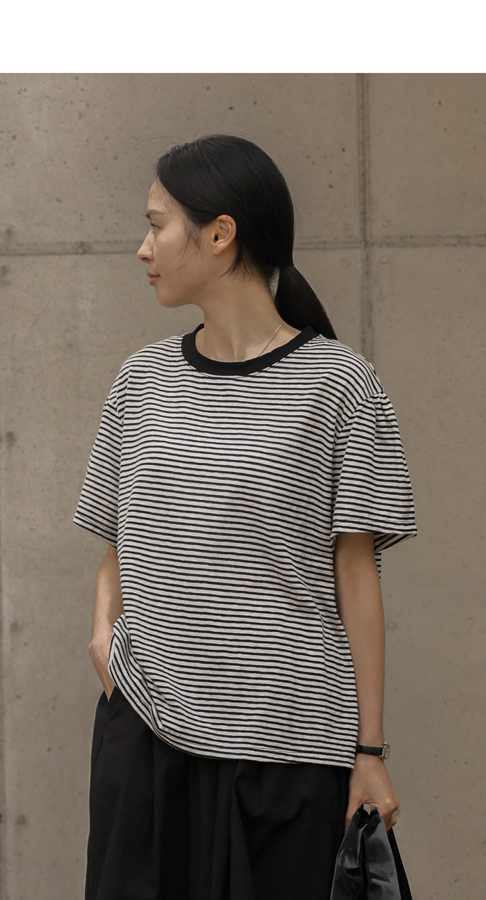 캐주얼하면서도 여성스러운 무드를 잃지 않는 제작 스트라이프 티셔츠예요. 스트라이프 패턴이 주는 경쾌함에 어깨 라인의 은은한 퍼프 디테일을 더해 일반적인 티셔츠보다 훨씬 격식 있고 차려입은 듯한 느낌을 준답니다.