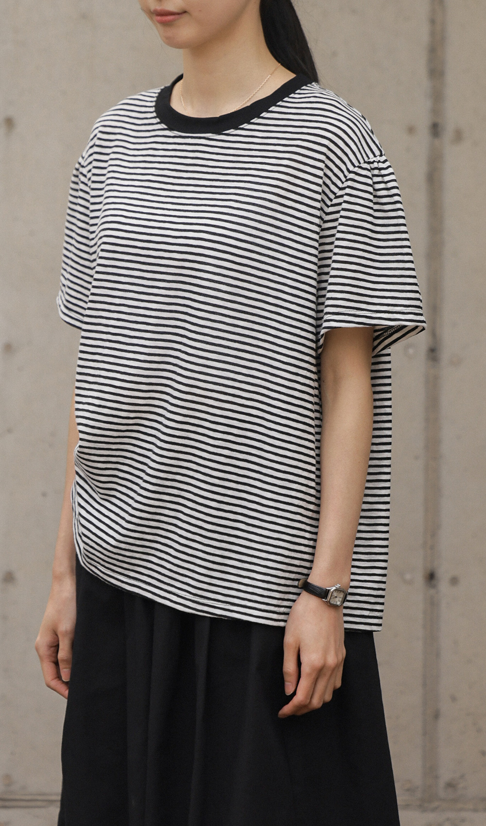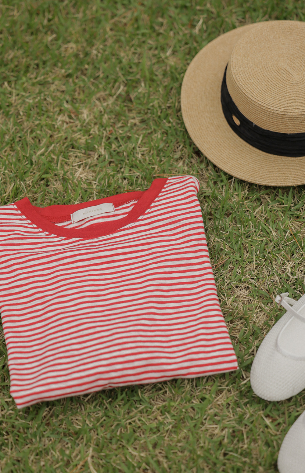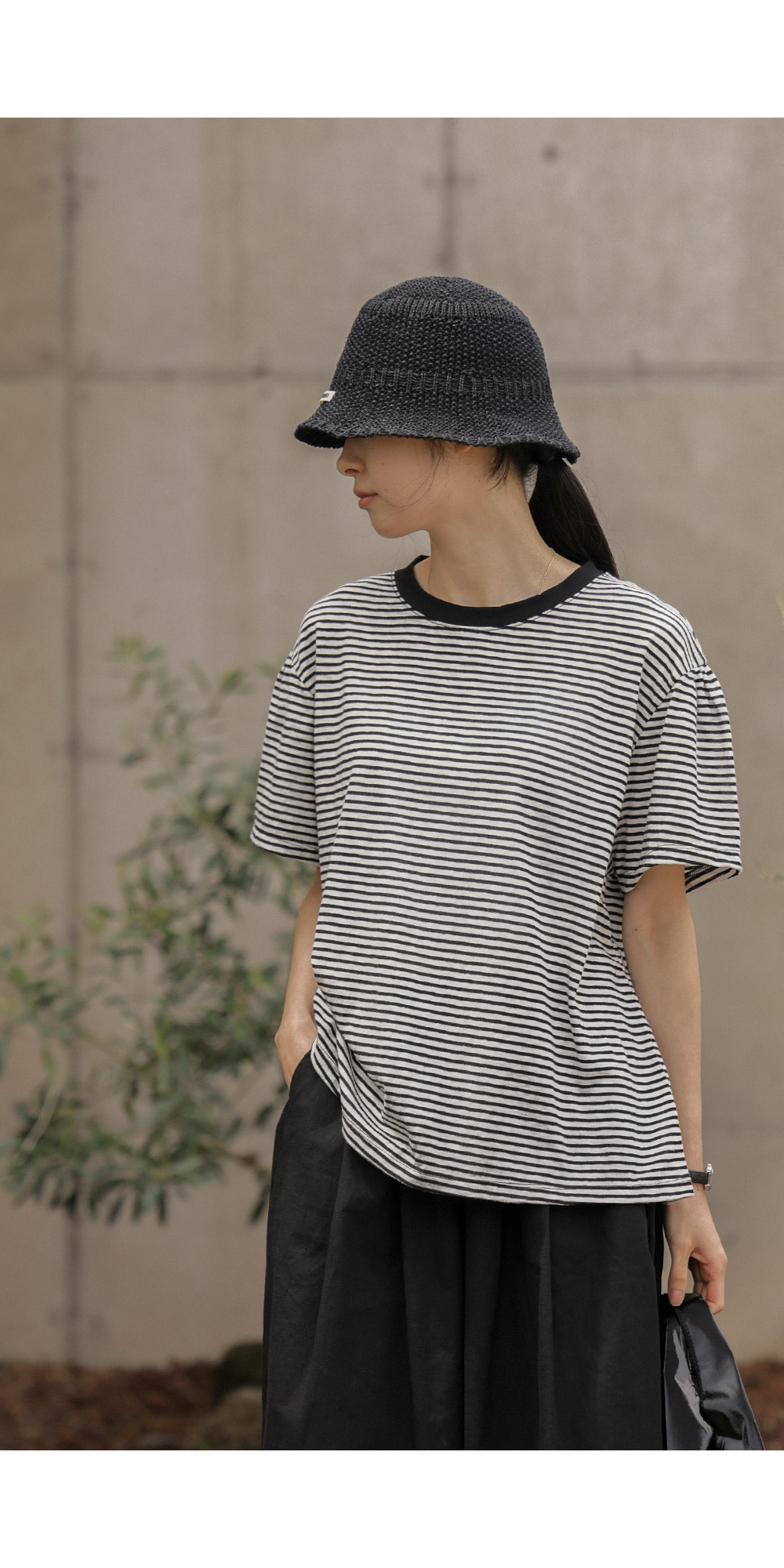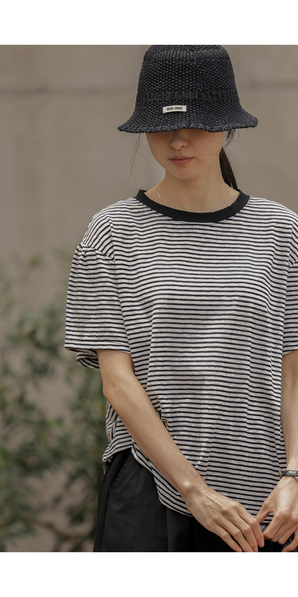 캐주얼하면서도 여성스러운 무드를 잃지 않는 제작 스트라이프 티셔츠예요. 스트라이프 패턴이 주는 경쾌함에 어깨 라인의 은은한 퍼프 디테일을 더해 일반적인 티셔츠보다 훨씬 격식 있고 차려입은 듯한 느낌을 준답니다.