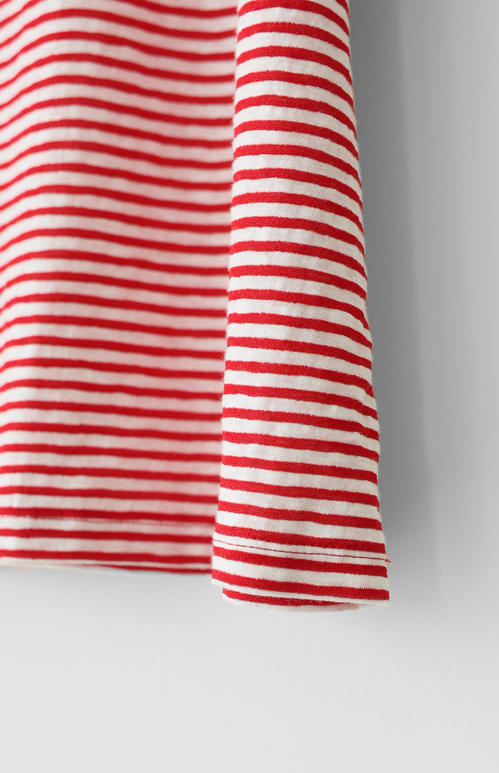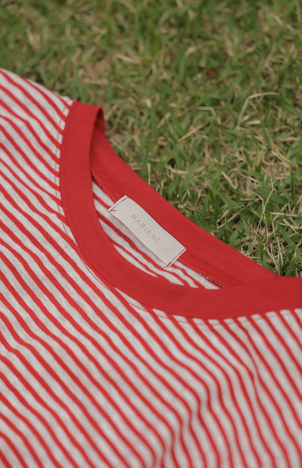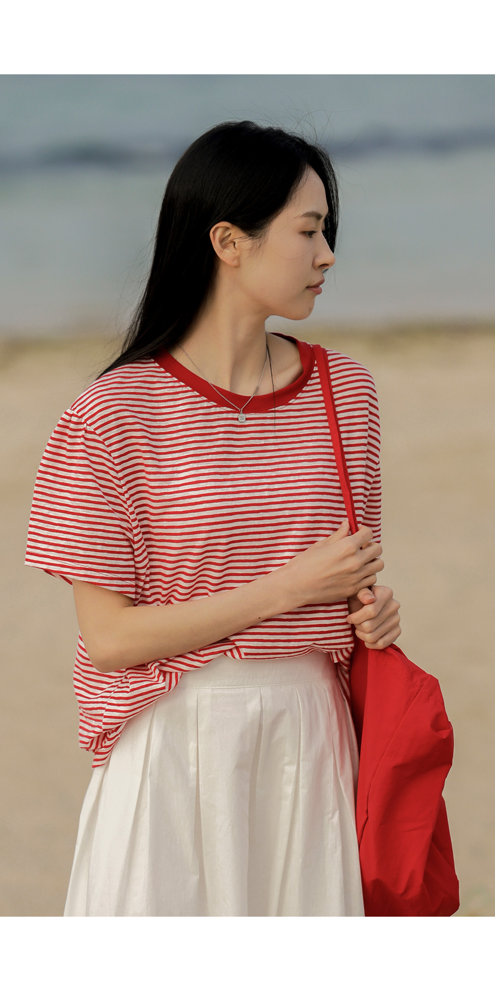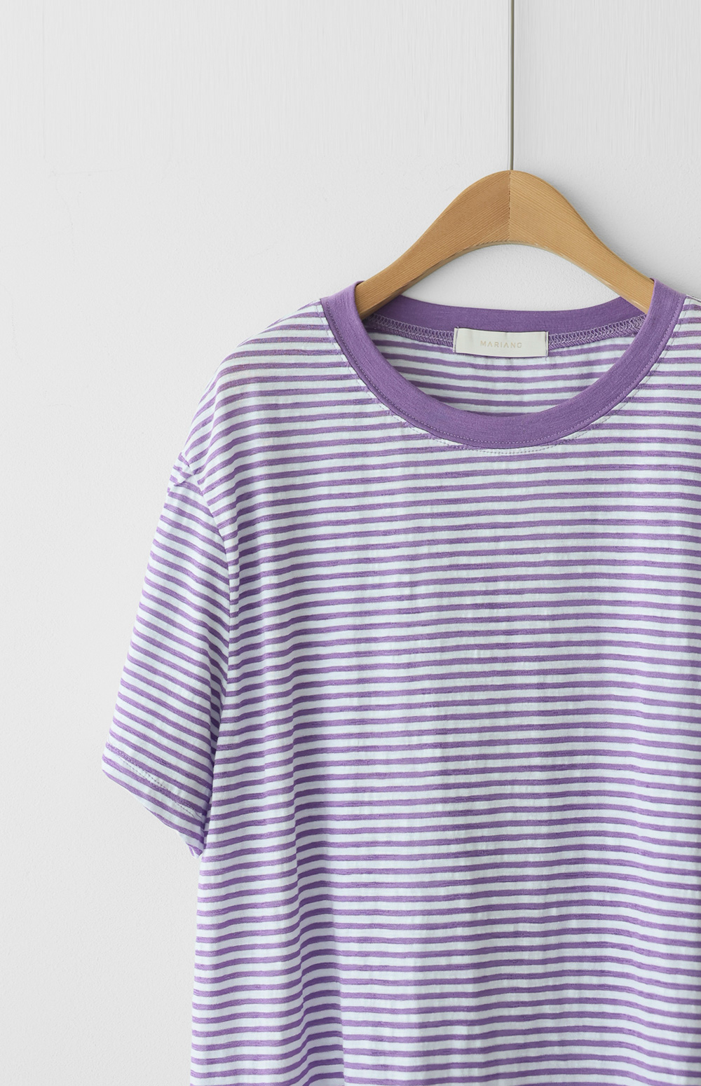 캐주얼하면서도 여성스러운 무드를 잃지 않는 제작 스트라이프 티셔츠예요. 스트라이프 패턴이 주는 경쾌함에 어깨 라인의 은은한 퍼프 디테일을 더해 일반적인 티셔츠보다 훨씬 격식 있고 차려입은 듯한 느낌을 준답니다.