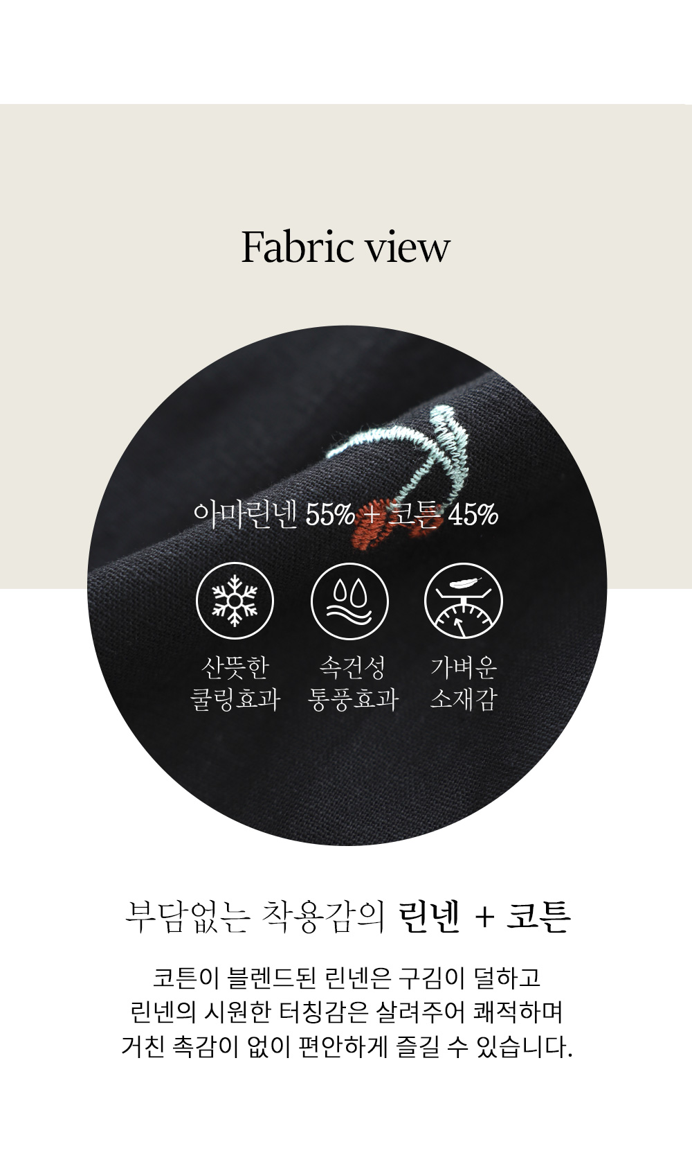 A:부드러운 코튼 소재가 섞여 있어 린넨 특유의 거친 느낌을 잡아주었기 때문에 자극 없이 아주 보들보들한 터칭감을 느끼실 수 있어요.