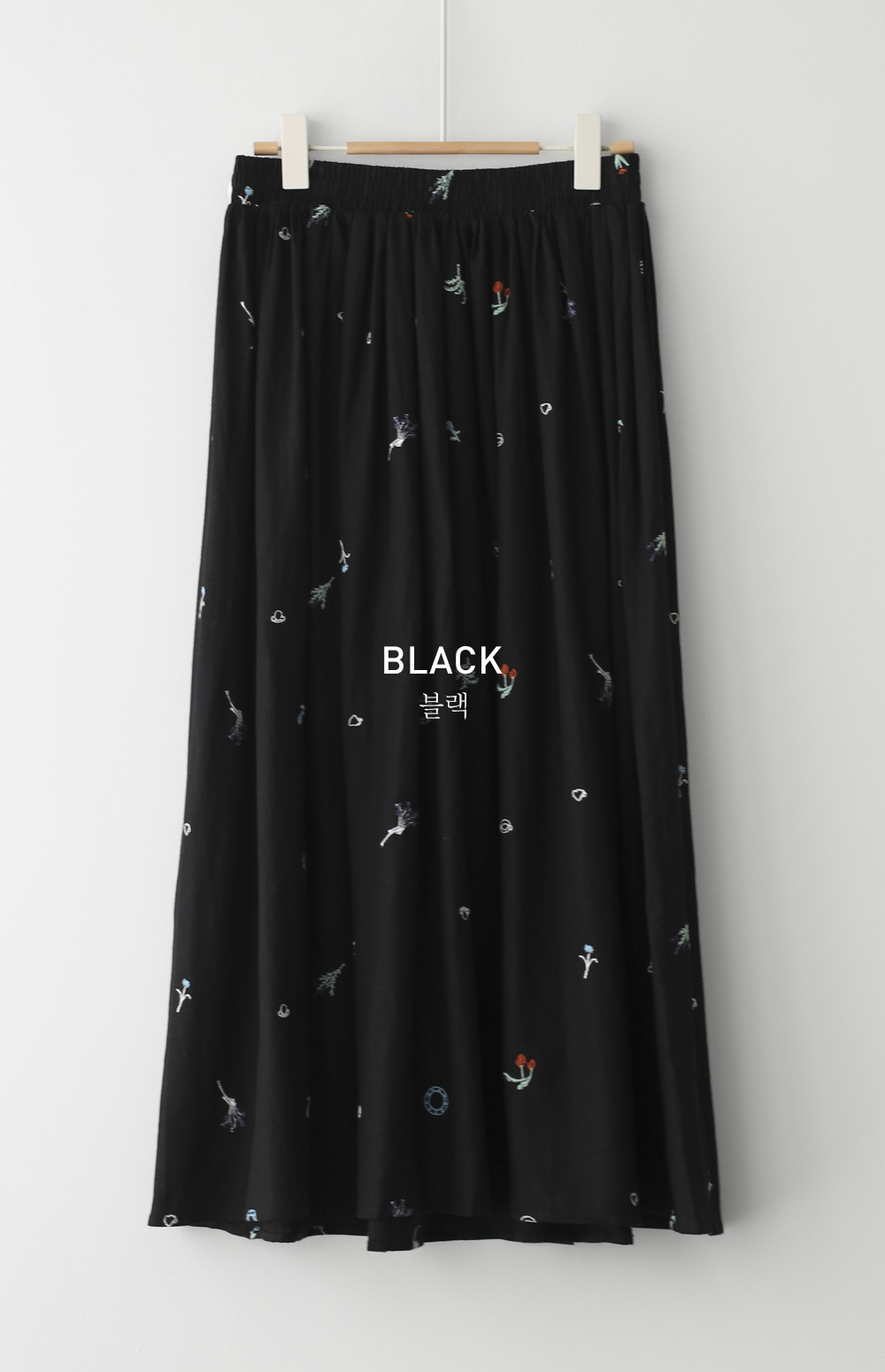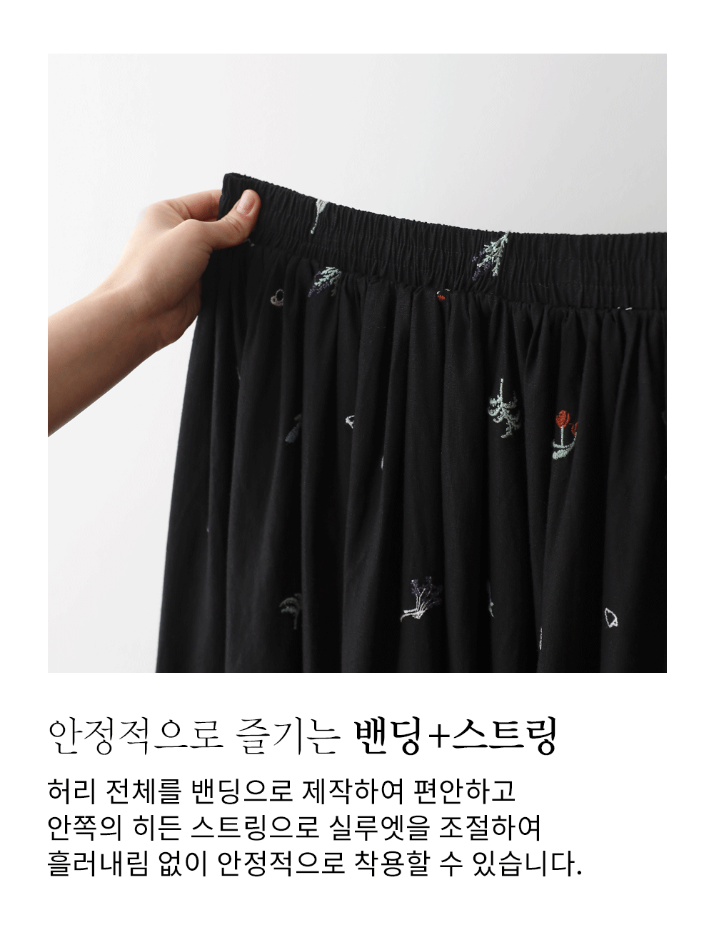 아름답게 퍼지는 실루엣이 매력적인 플레어 디자인의 스커트에요. 가장 날씬해 보이면서도 자수의 화려함이 돋보이는 블랙 단일 컬러로 준비했구요.