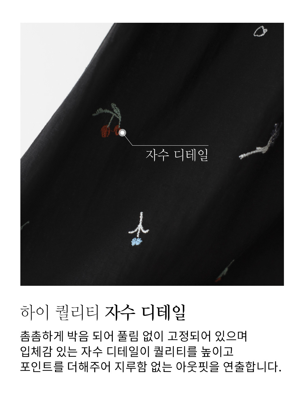 A:시크한 블랙 컬러가 베이스라 시각적으로 수축 효과를 주며, 자수가 시선을 사선으로 분산시켜 오히려 더 슬림해 보이니 안심하세요.