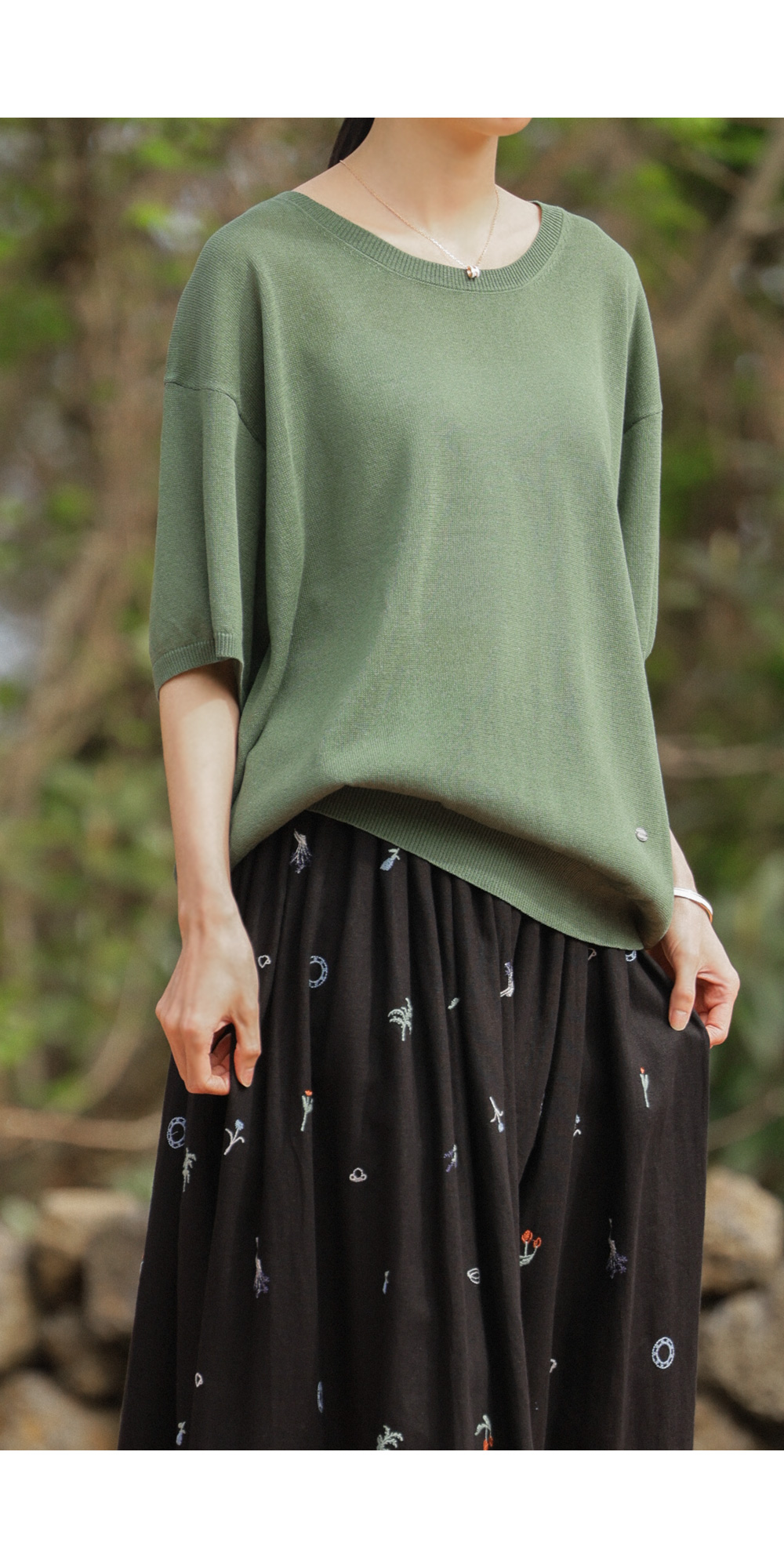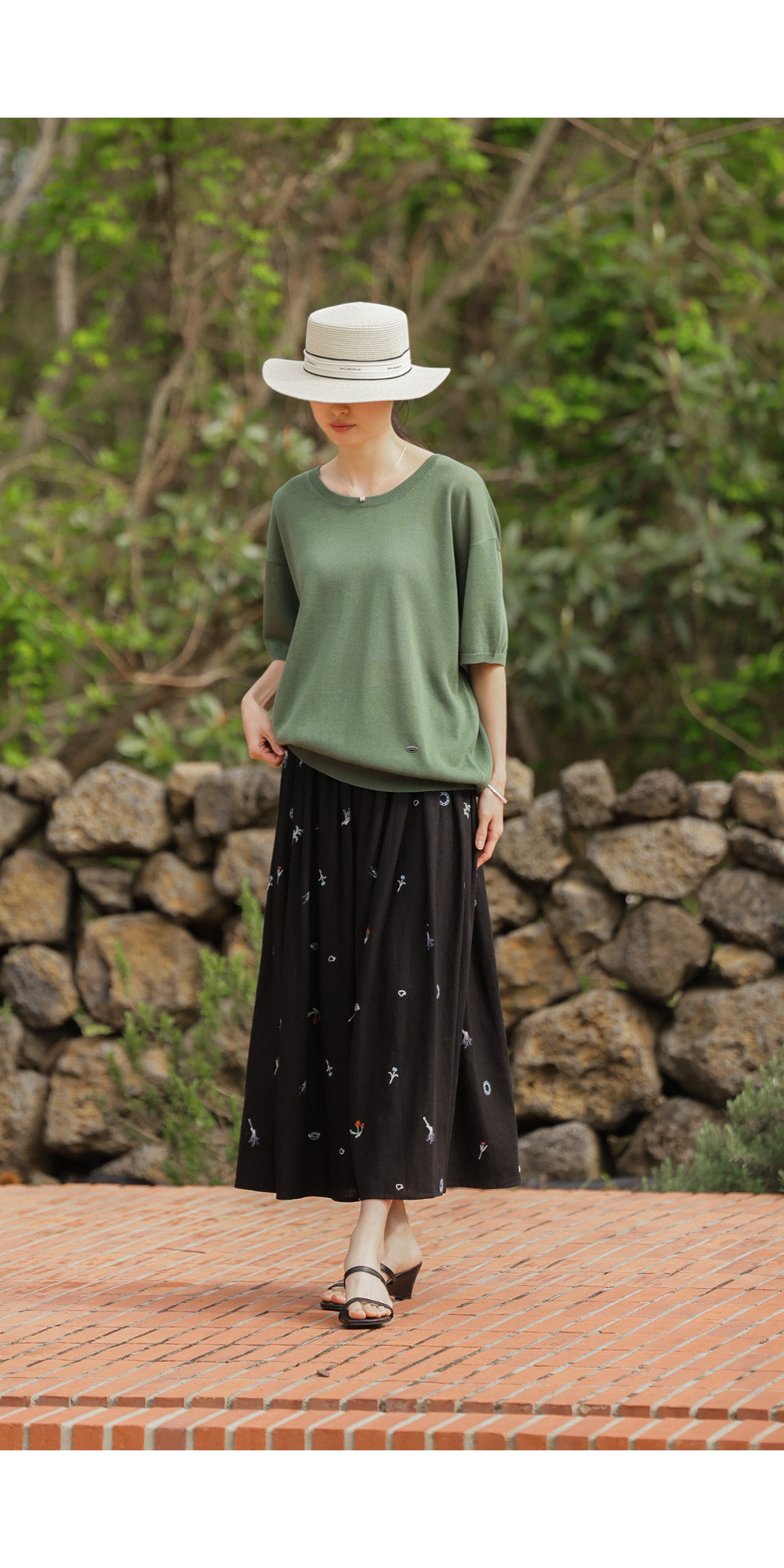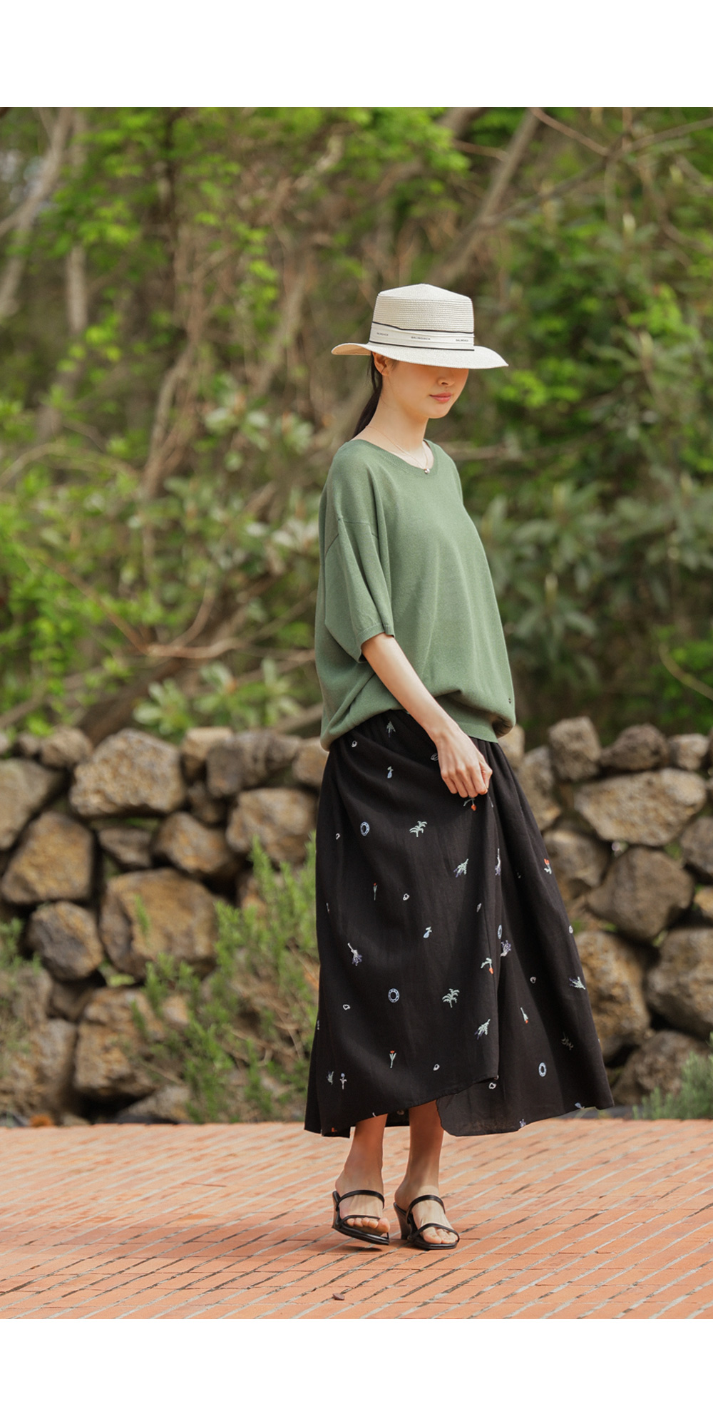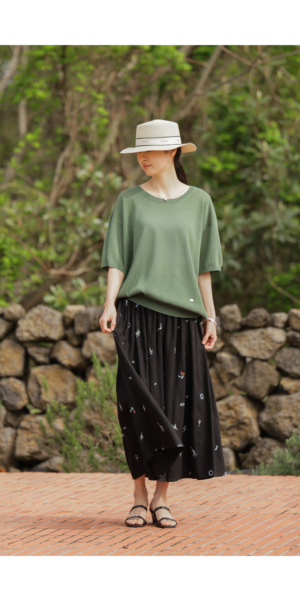 자수 패턴이 들어간 스커트는 자칫 부해 보일까 걱정하시지만, 이 제품은 소재가 워낙 얇고 가벼워 부피감보다는 살랑이는 실루엣이 먼저 눈에 들어온답니다.