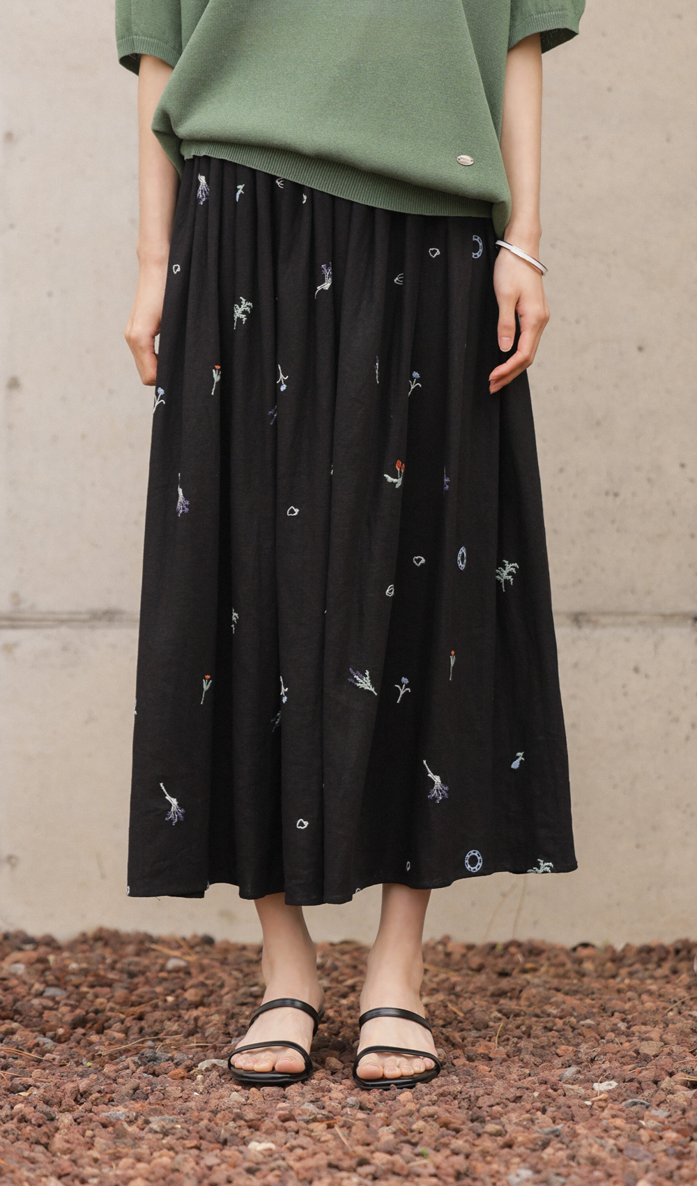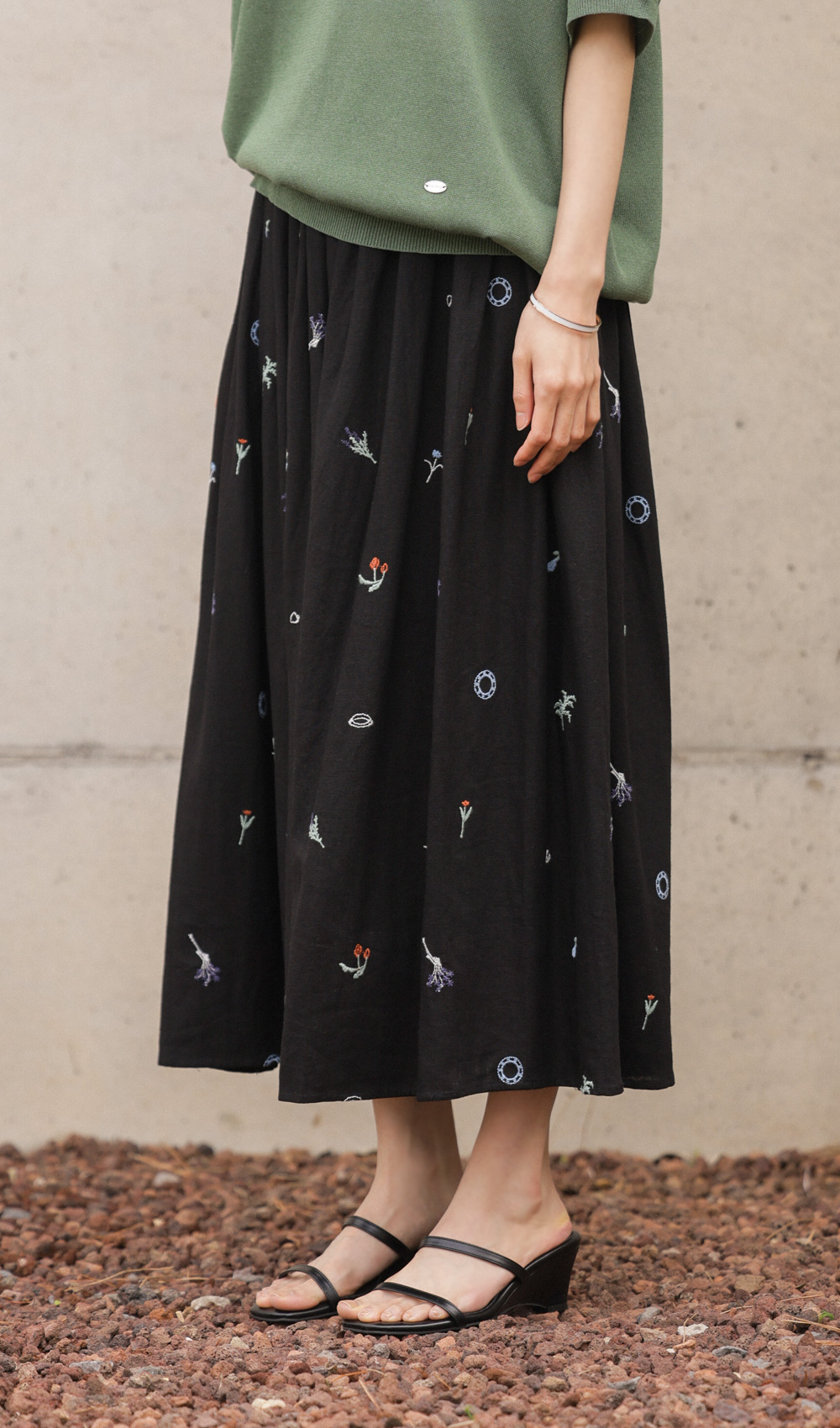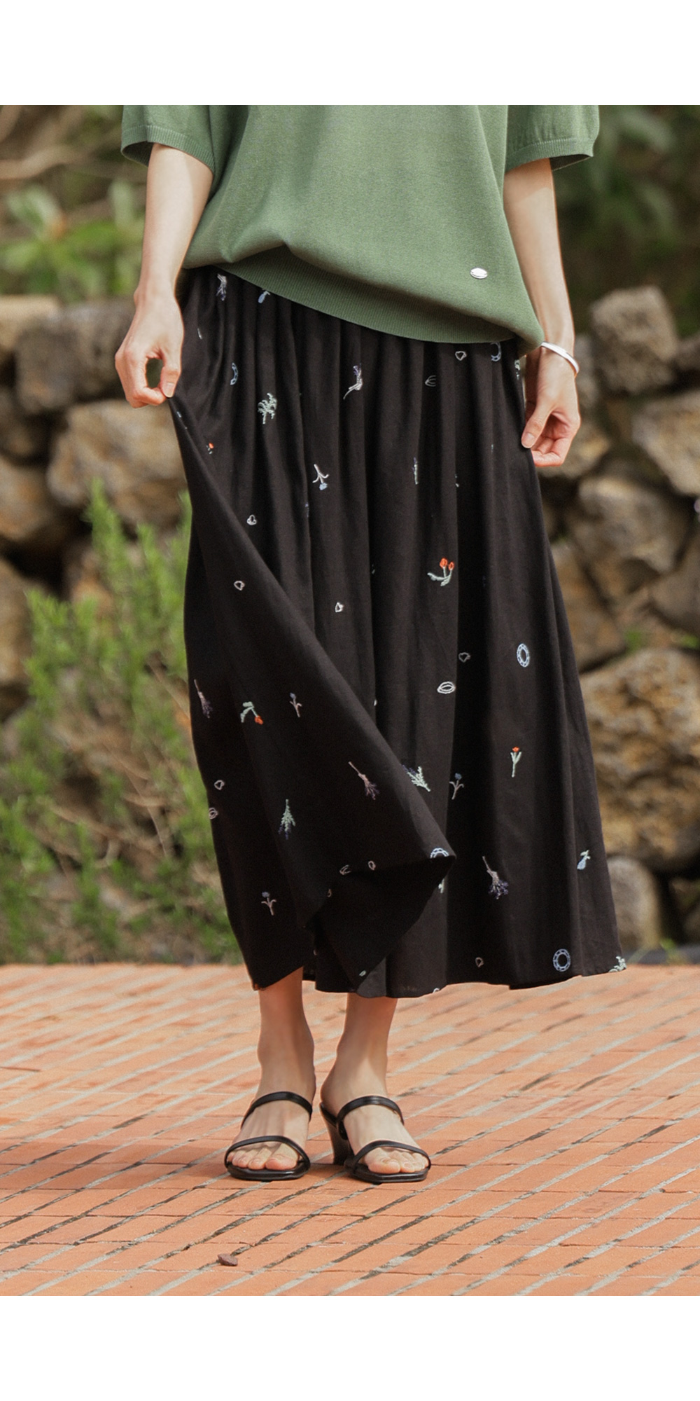 이 스커트의 결정적인 한 끗은 바로 블랙 컬러와 자수 디테일이 주는 입체감이에요. 자칫 부해 보일 수 있는 플레어 라인이지만,