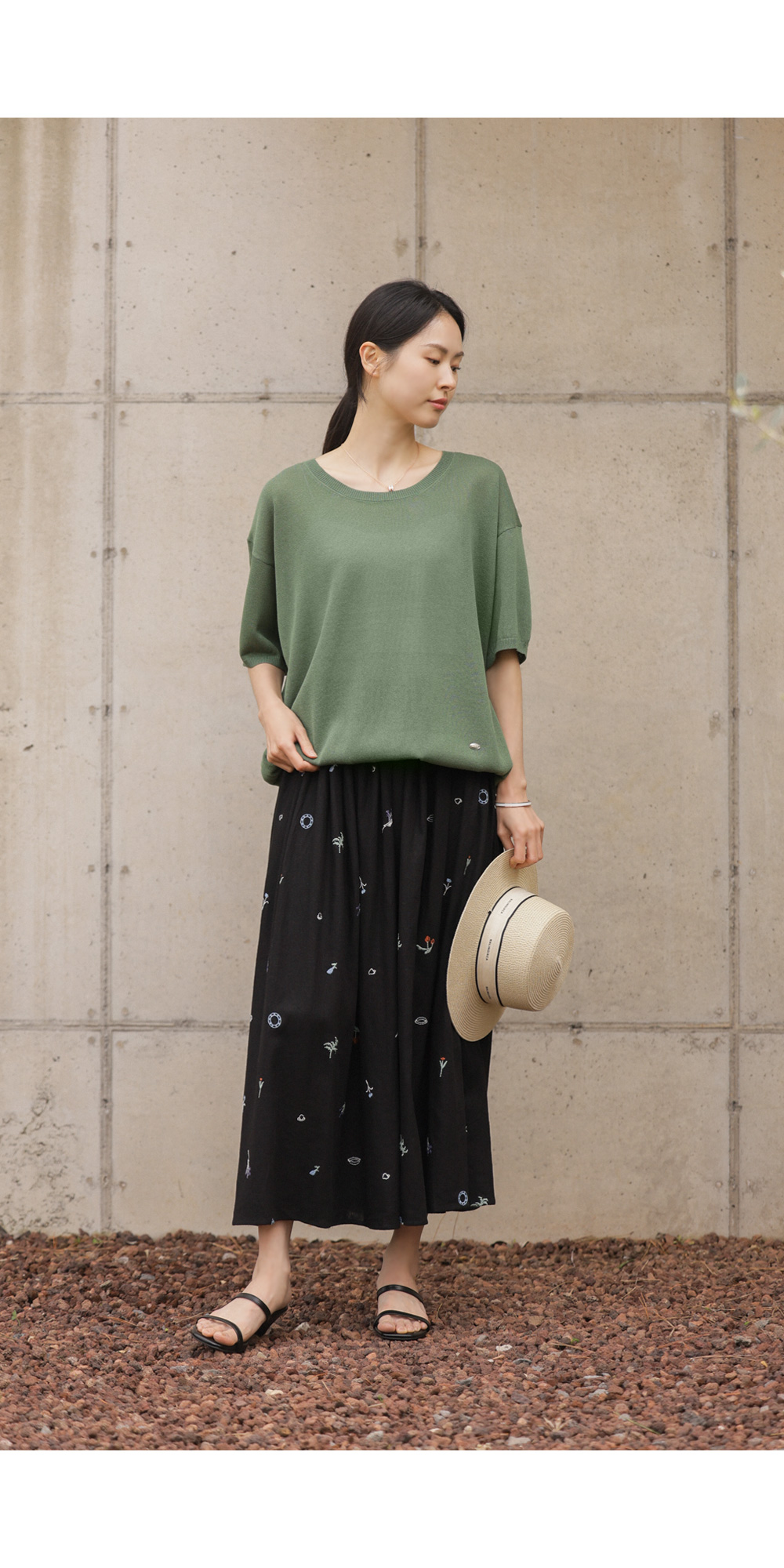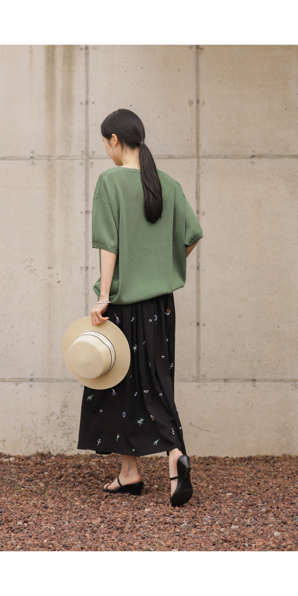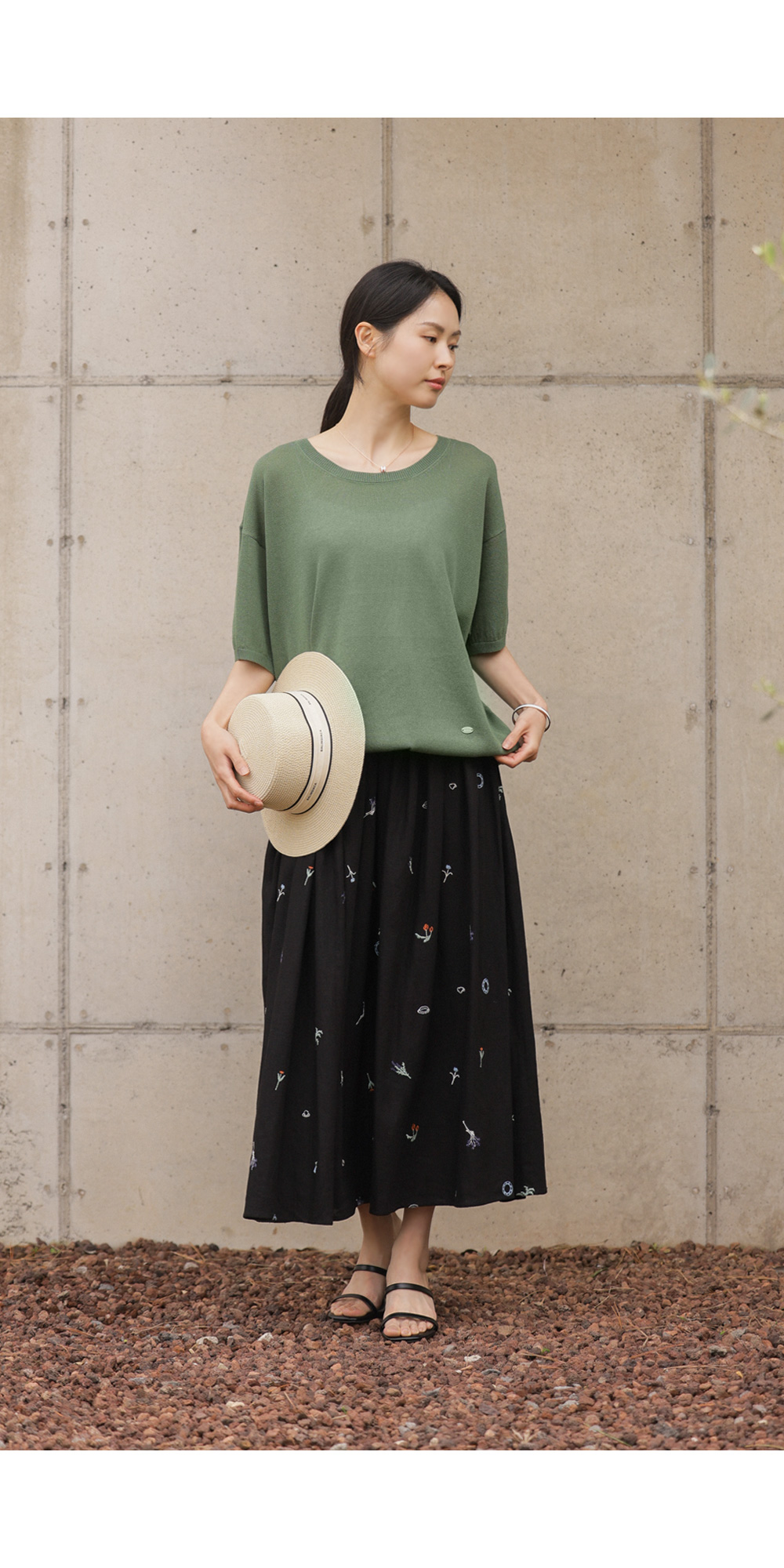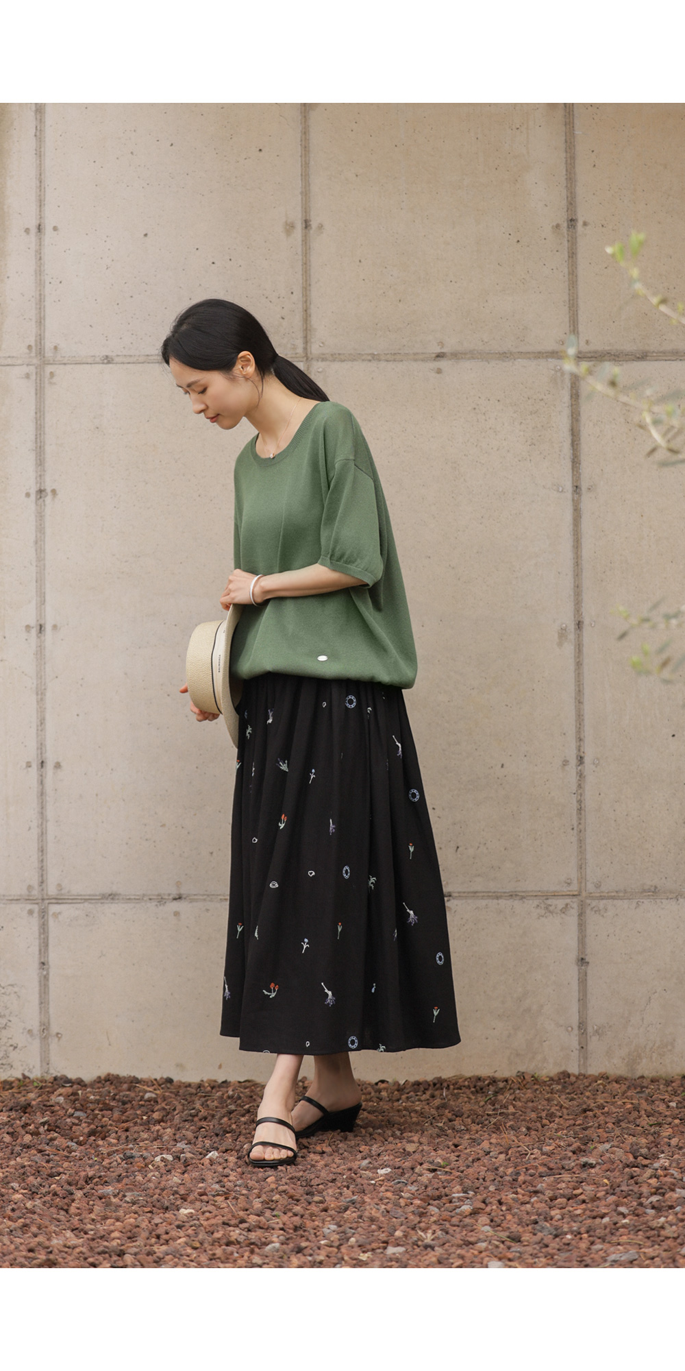 이 스커트의 결정적인 한 끗은 바로 블랙 컬러와 자수 디테일이 주는 입체감이에요. 자칫 부해 보일 수 있는 플레어 라인이지만,